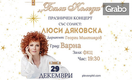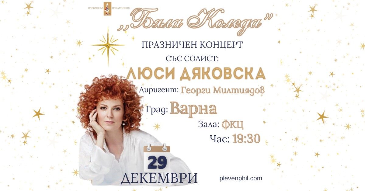 Плевенска филхармония представя "Бяла Коледа" - празничен концерт на Люси Дяковска с диригент Георги Милтиядов: на 29 Декември, в Зала 1 на ФКЦ - Варна