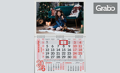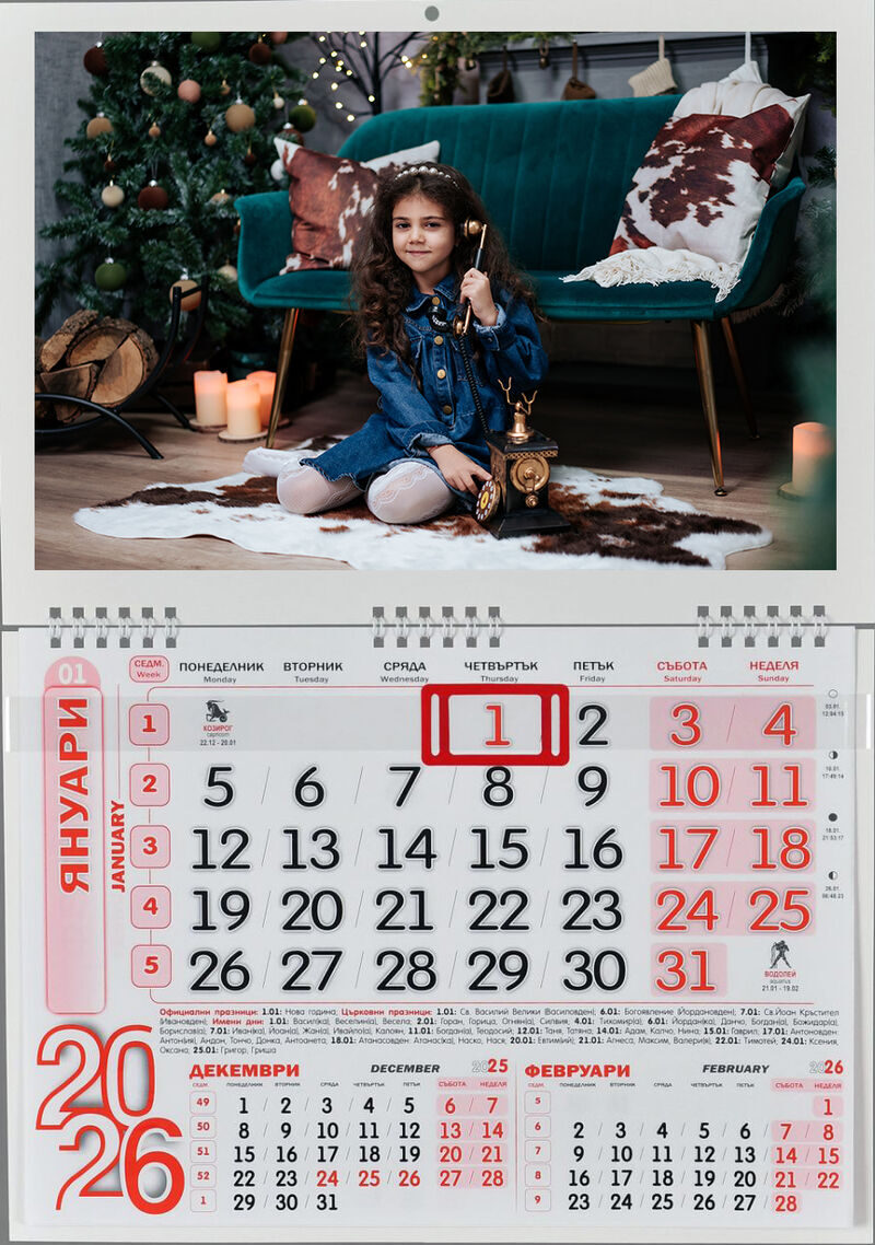 Календарът е с картонена основа със снимка размер А4, едносекционен, червен цвят за 2026г.
