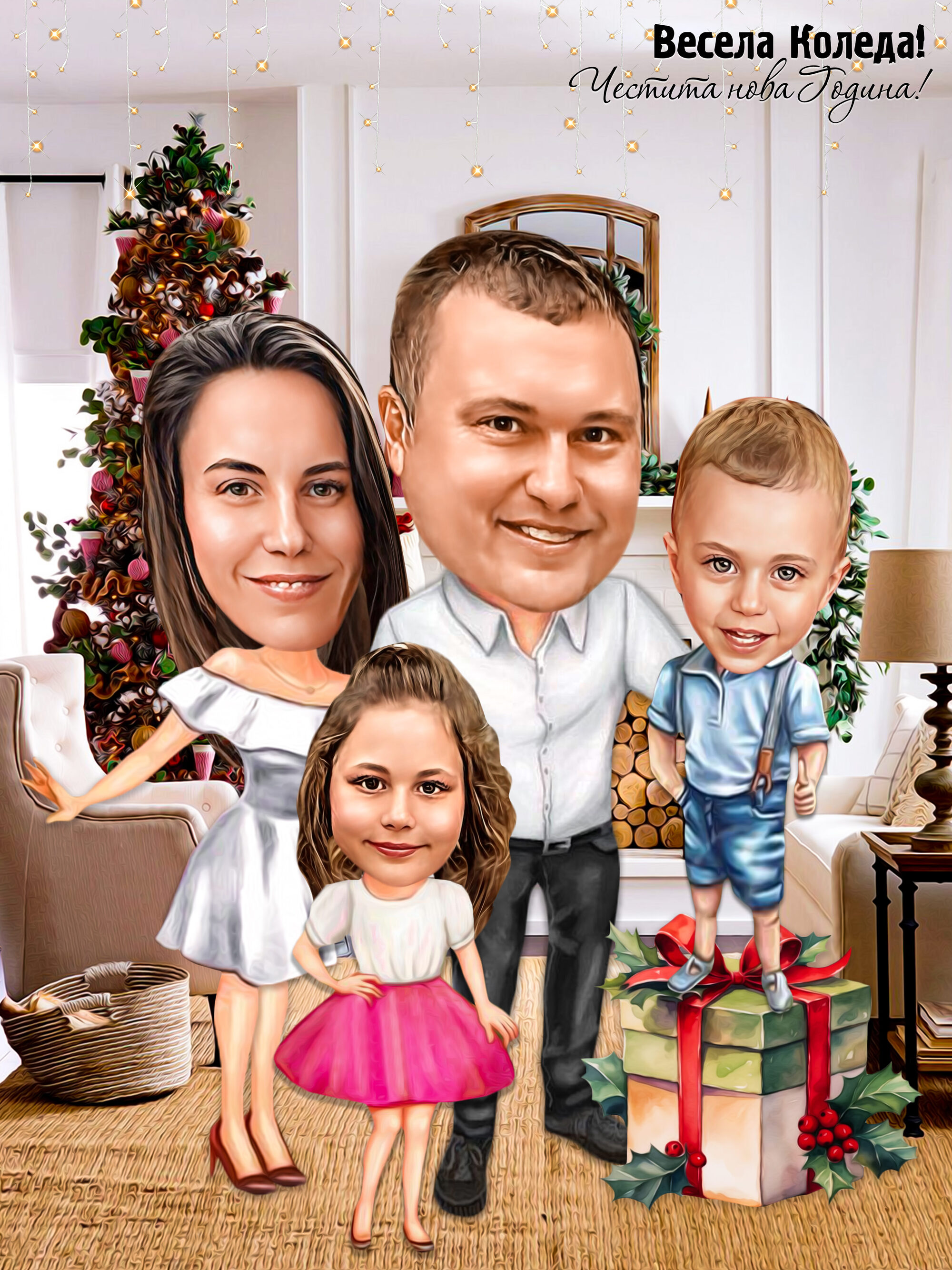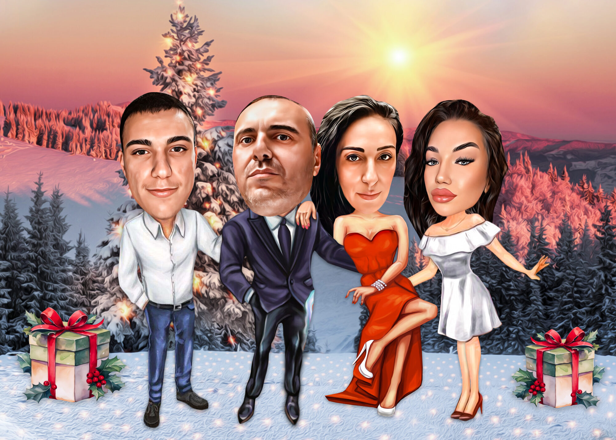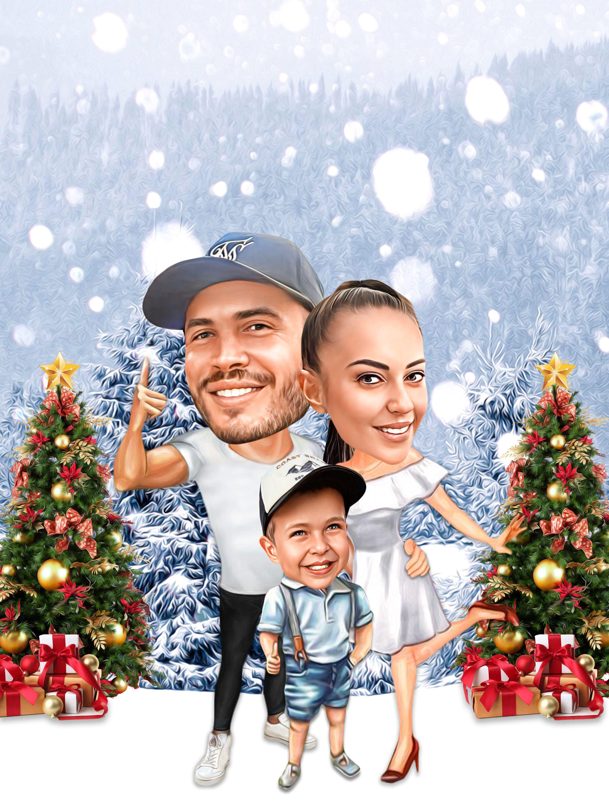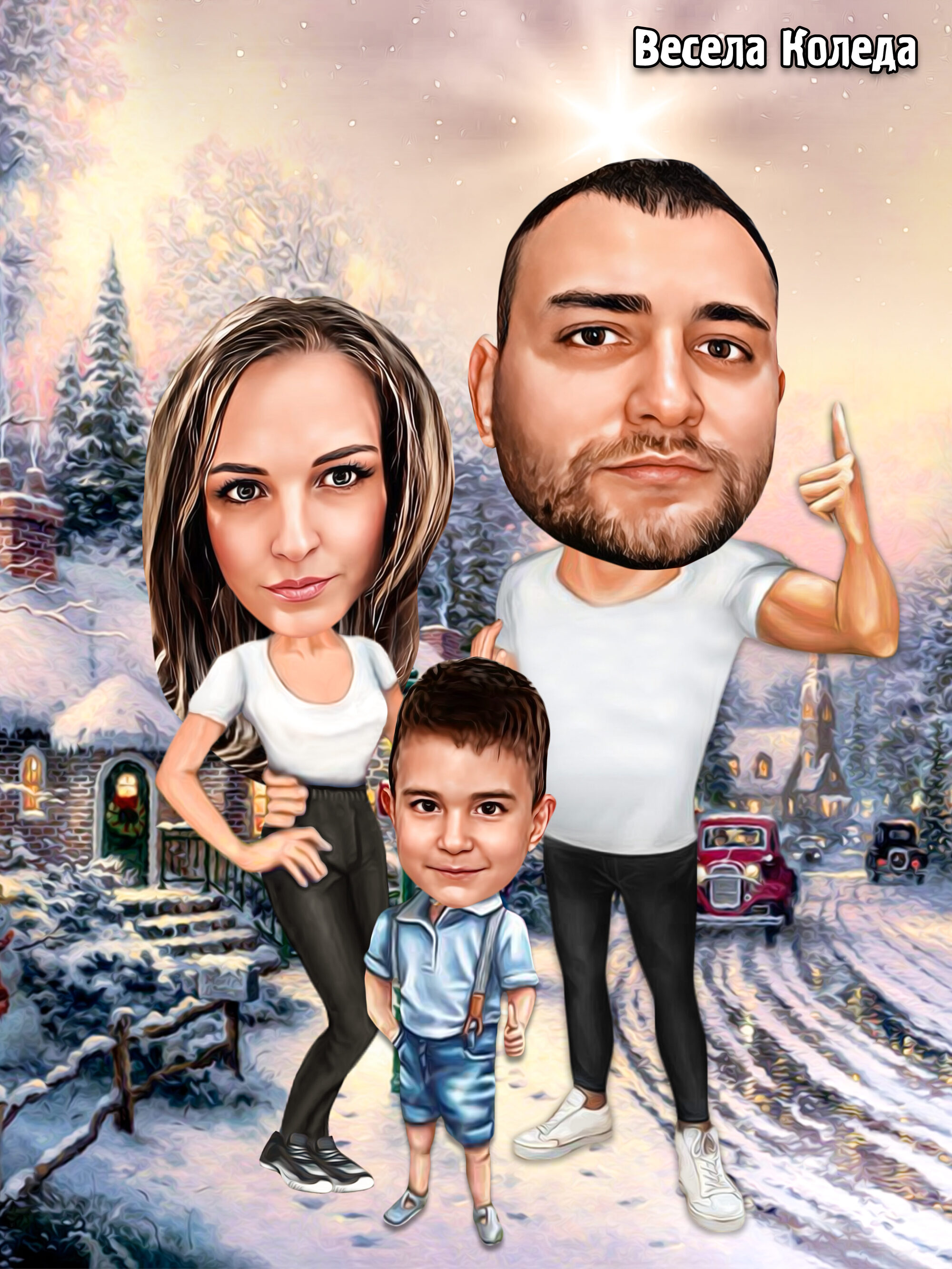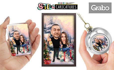 Коледна дигитална карикатура с до 3 лица, плюс магнит или коледна топка с готовата карикатура, от Stela Caricatures