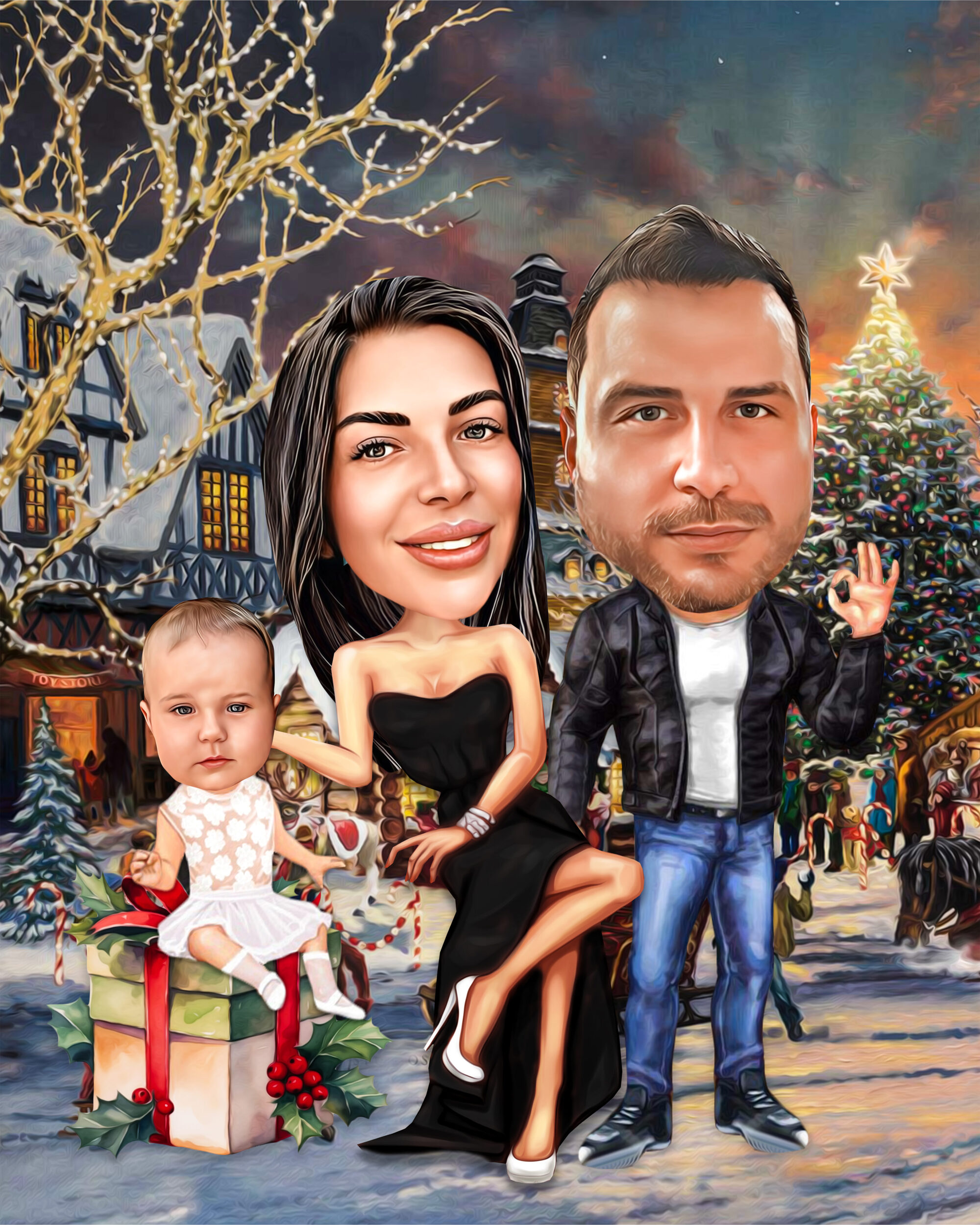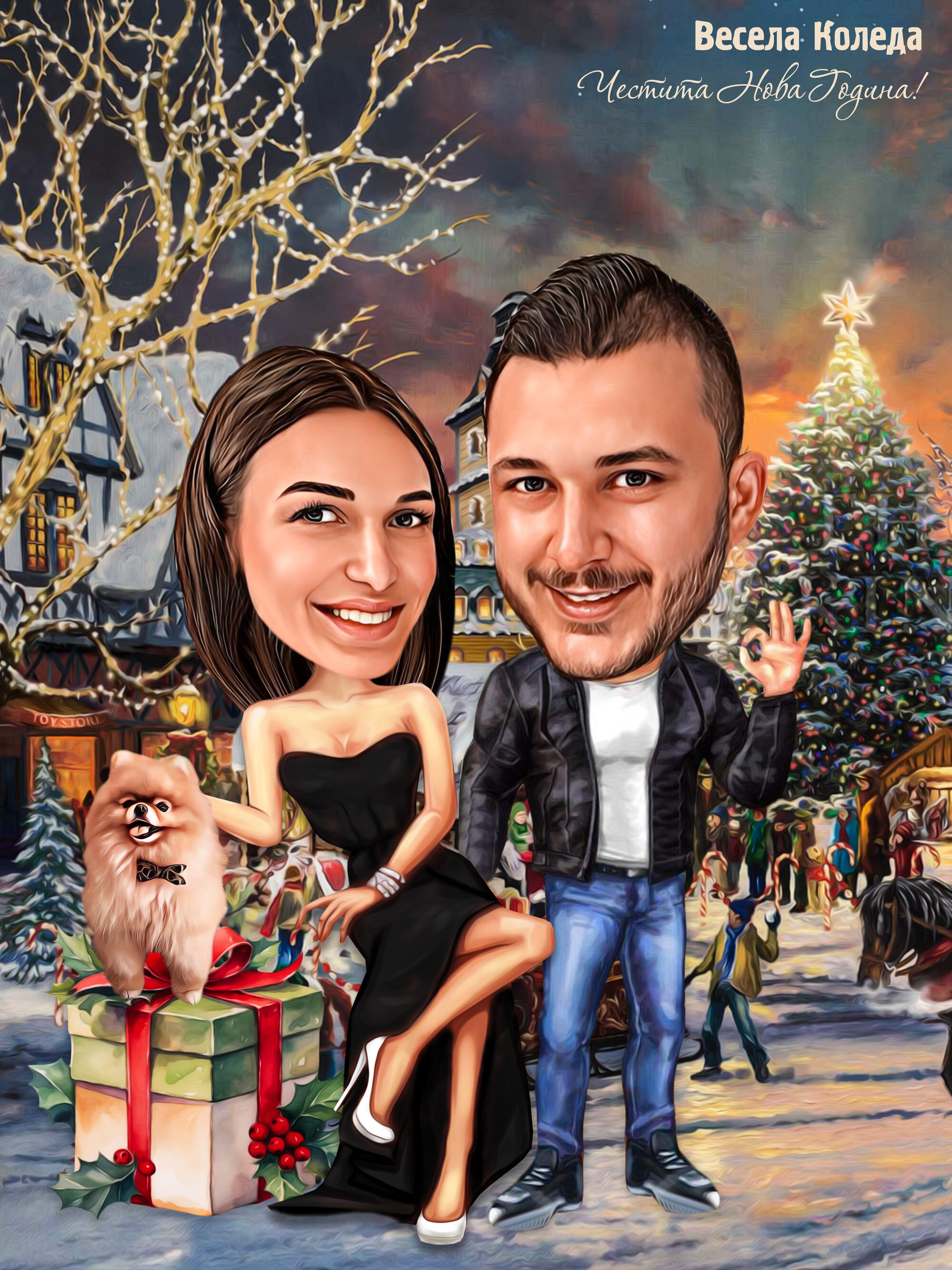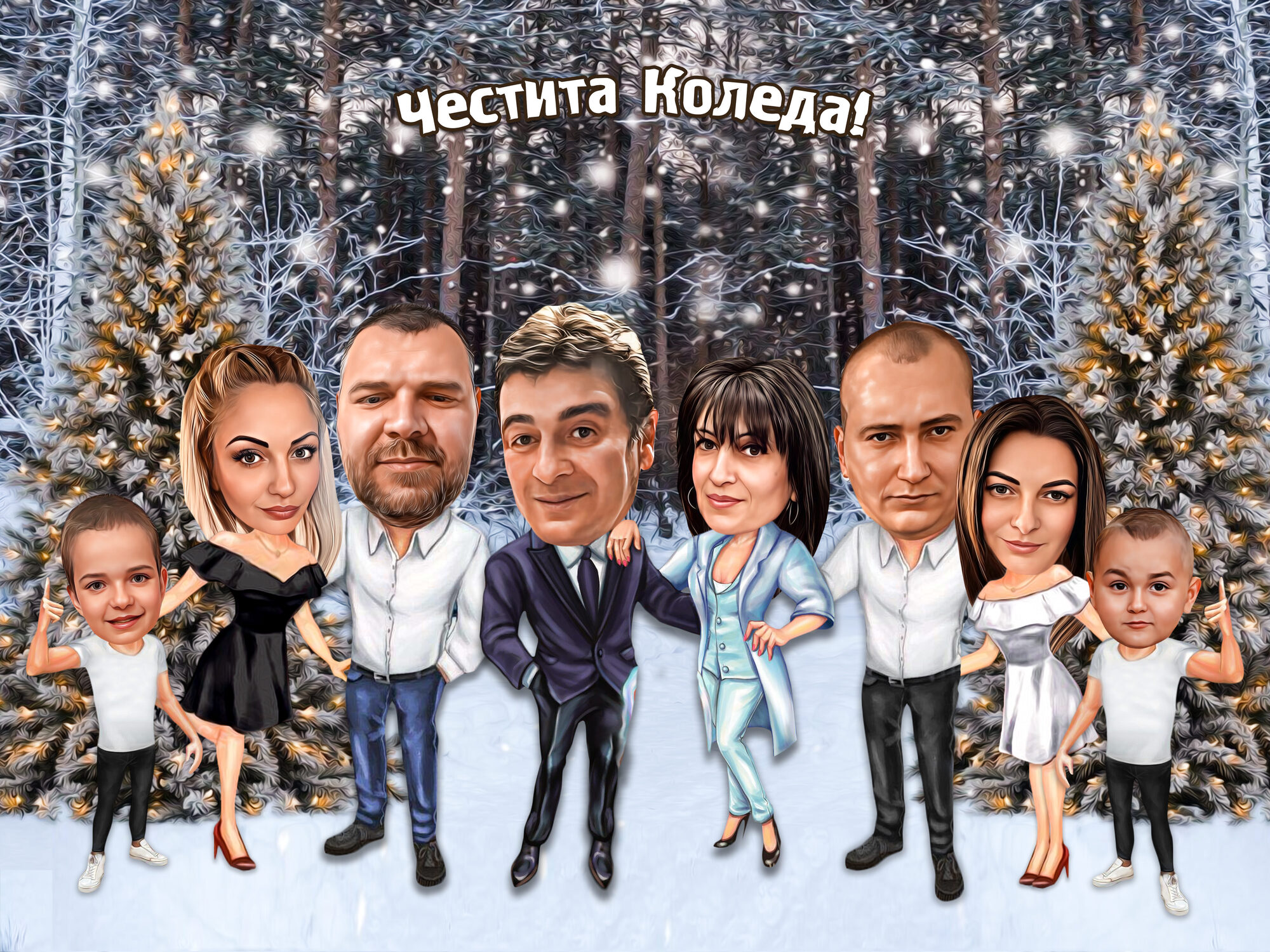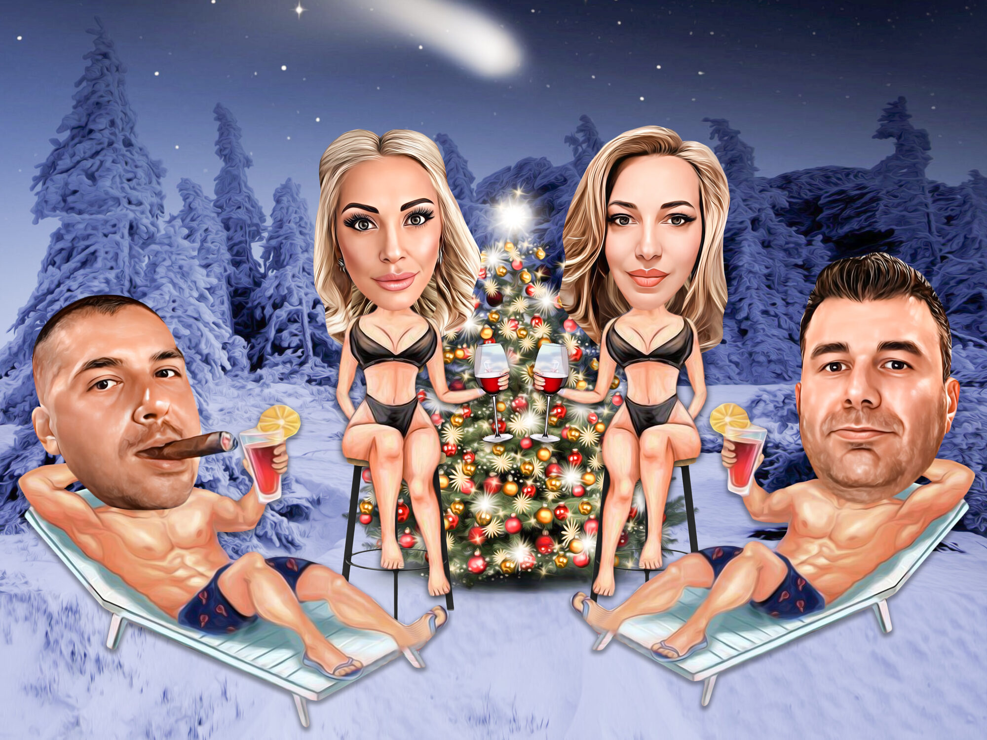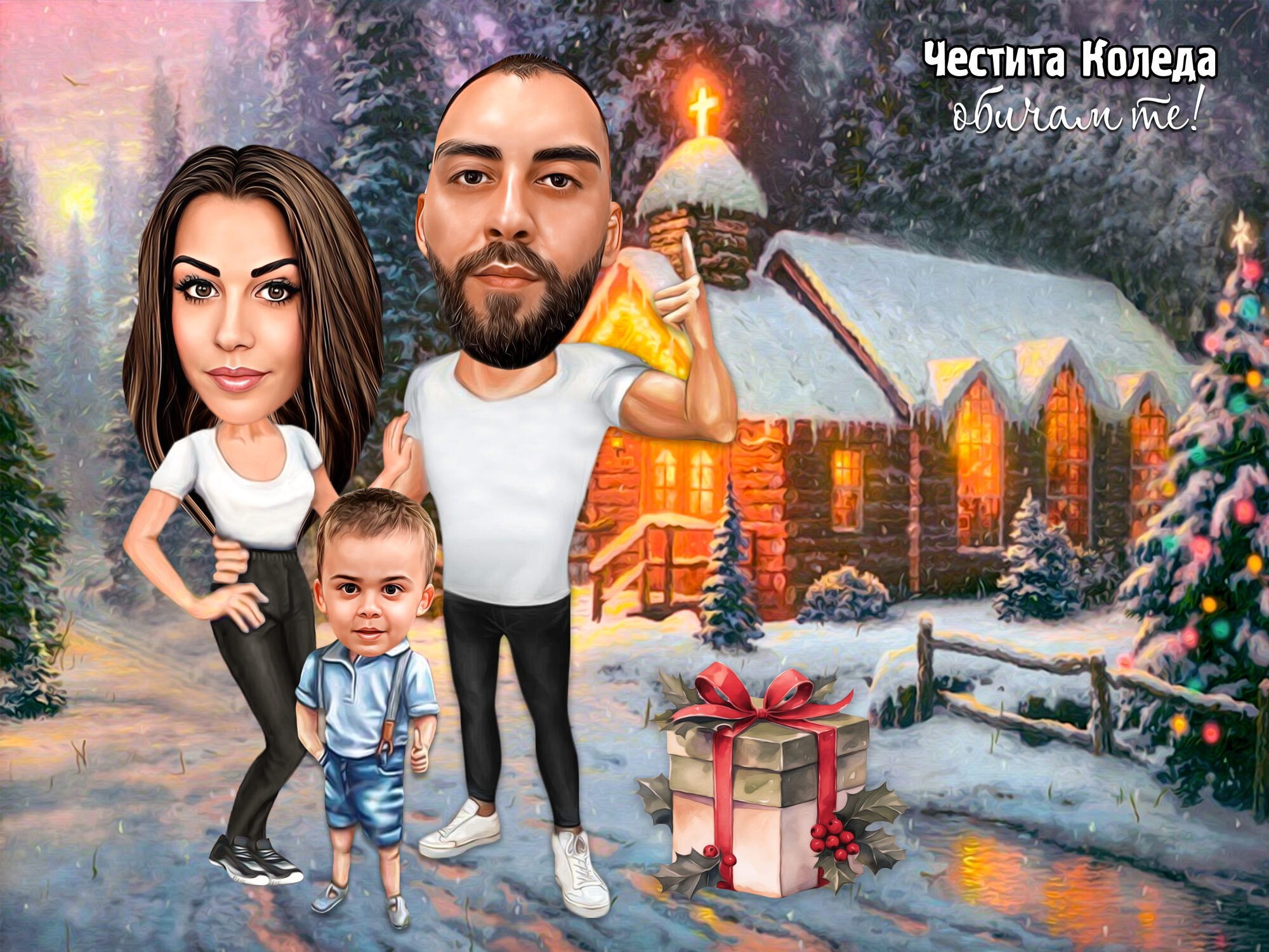 Коледна дигитална карикатура с до 3 лица, плюс магнит или коледна топка с готовата карикатура, от Stela Caricatures