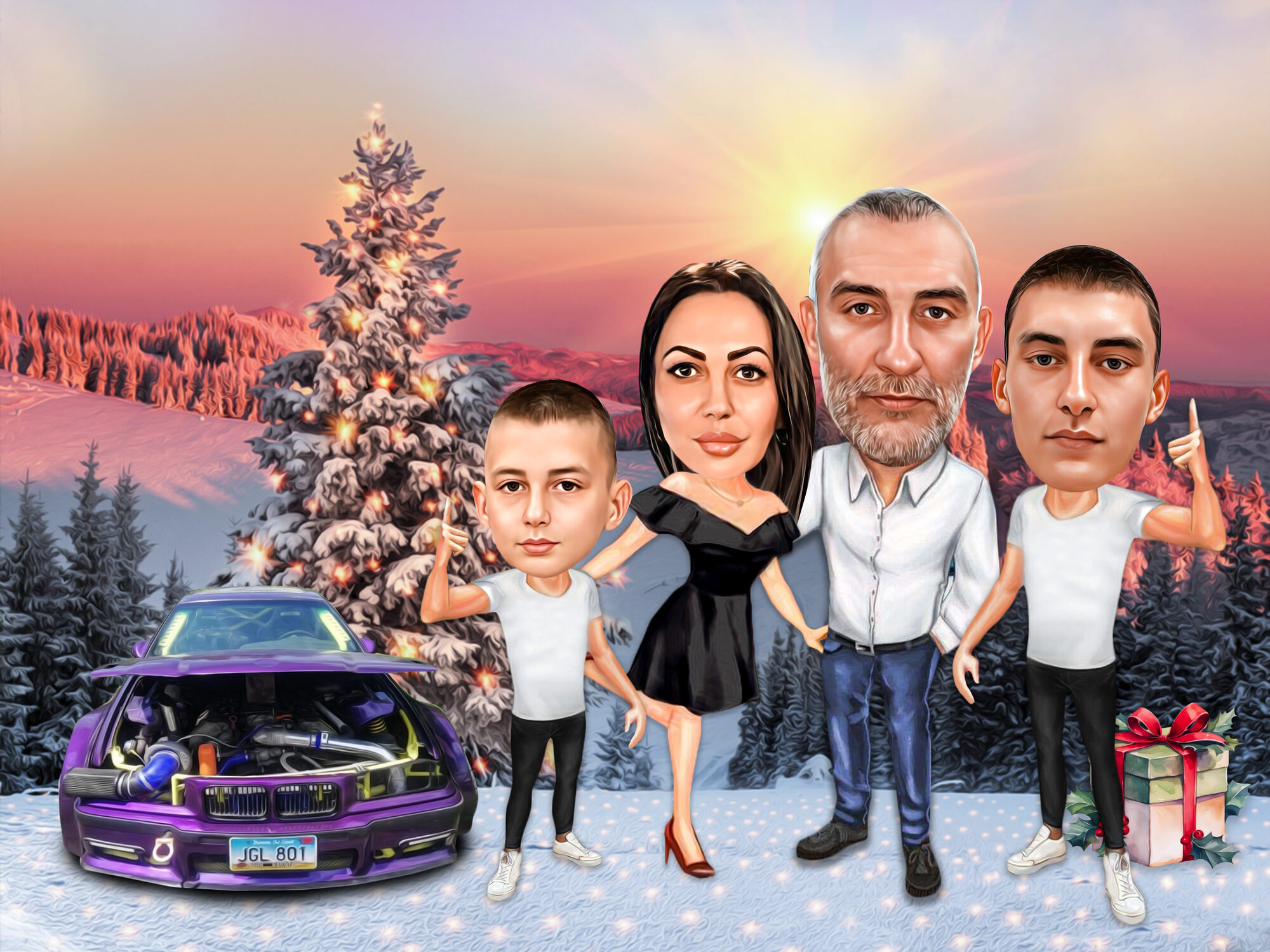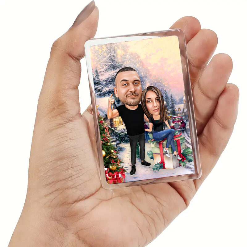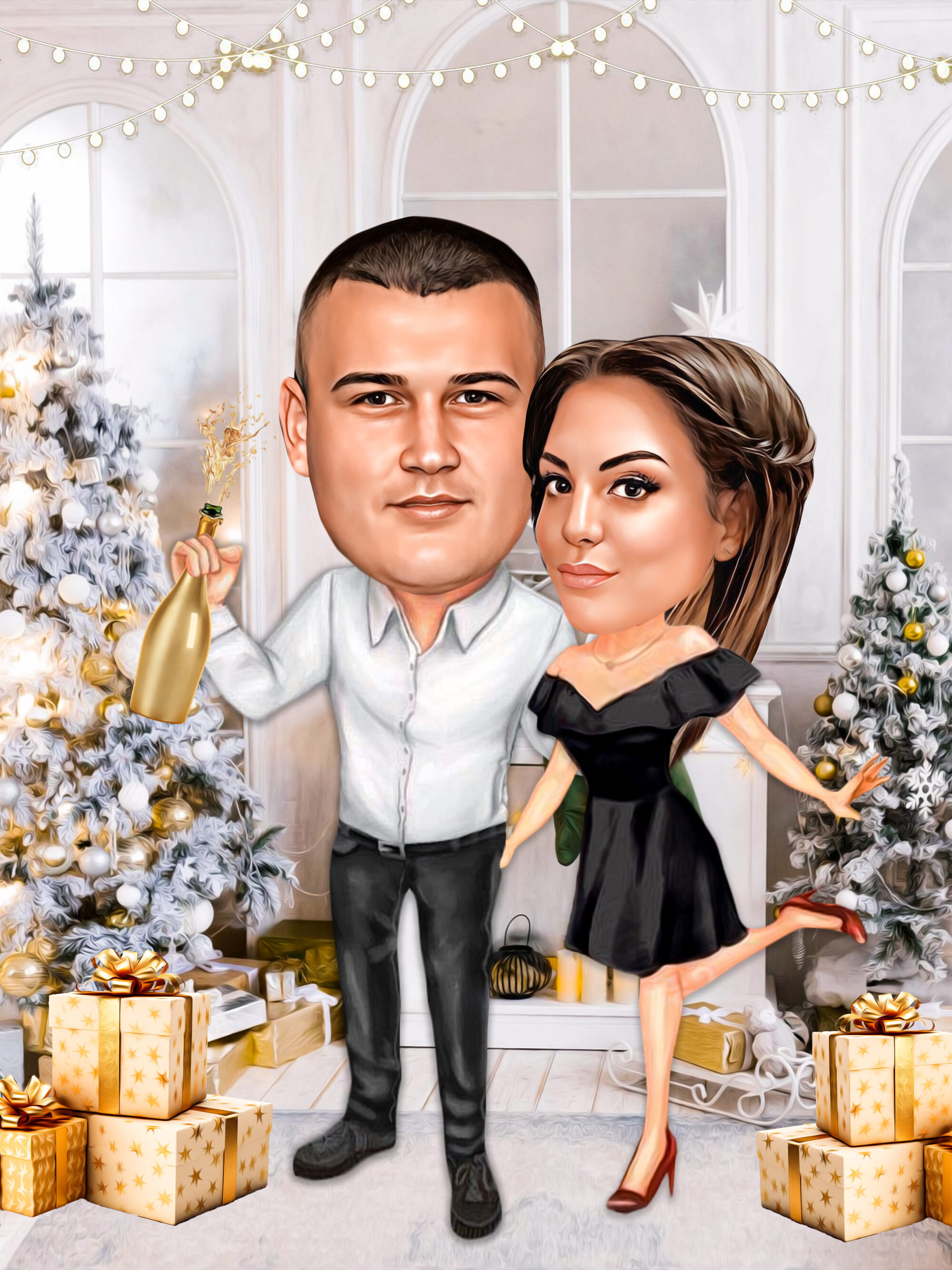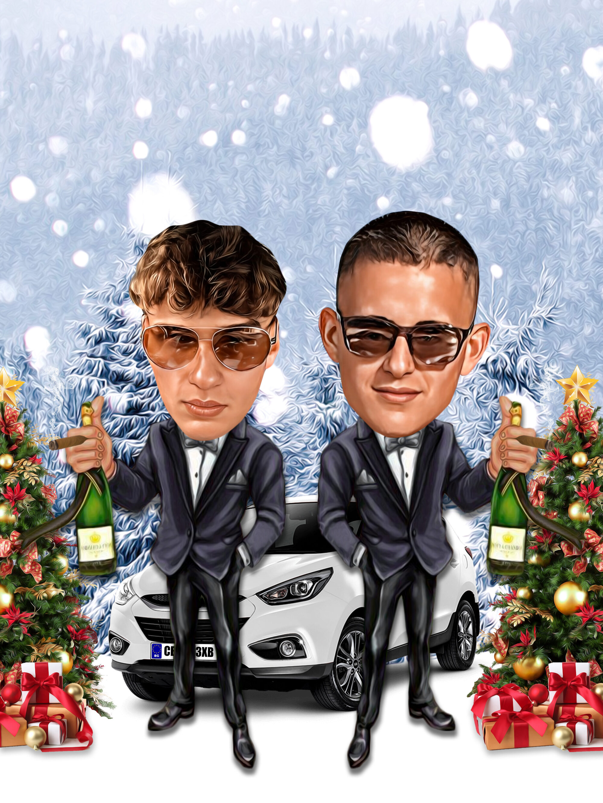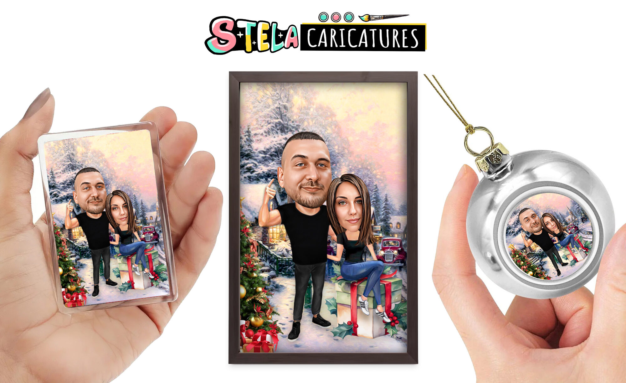 Коледна дигитална карикатура с до 3 лица, плюс магнит или коледна топка с готовата карикатура, от Stela Caricatures