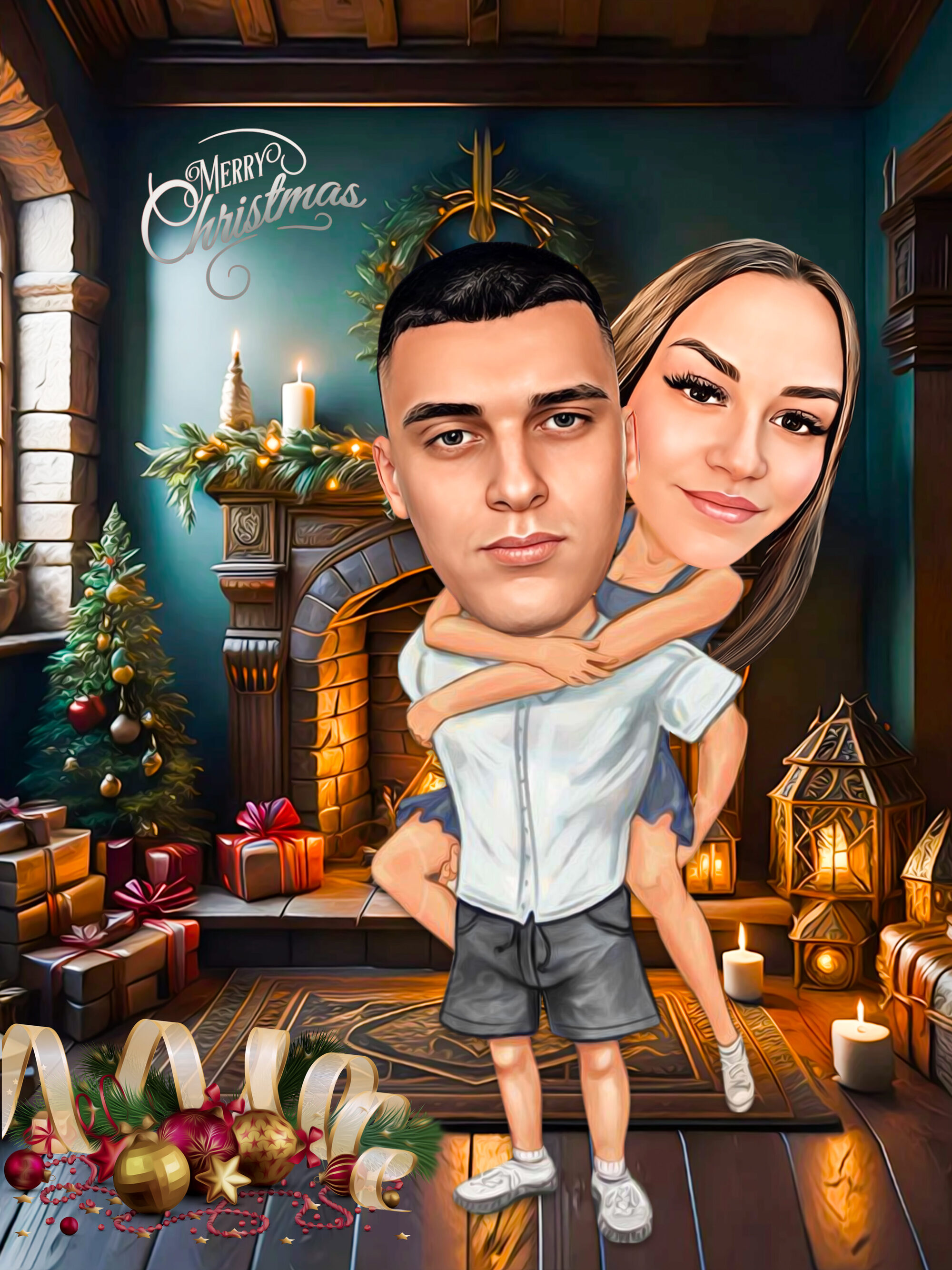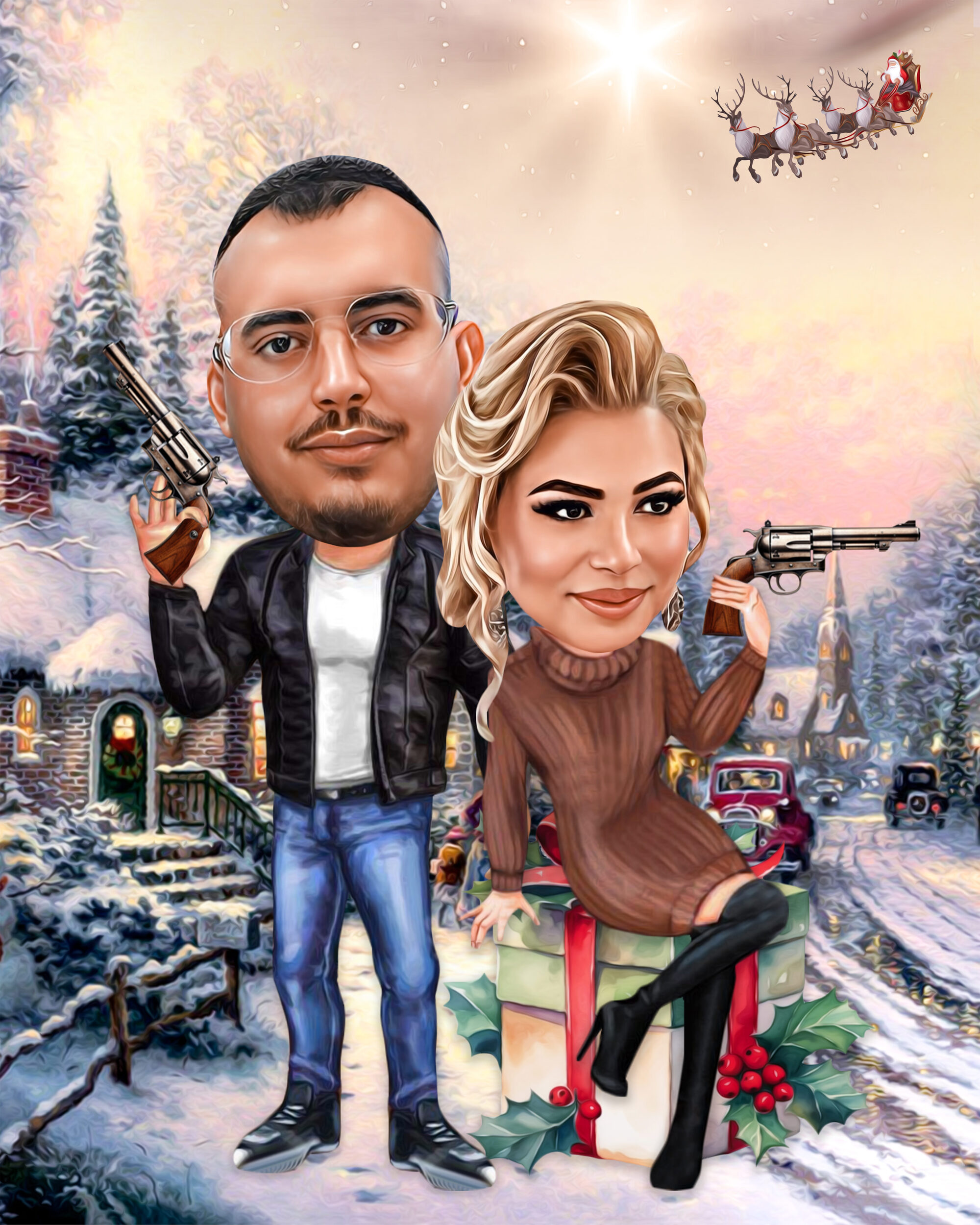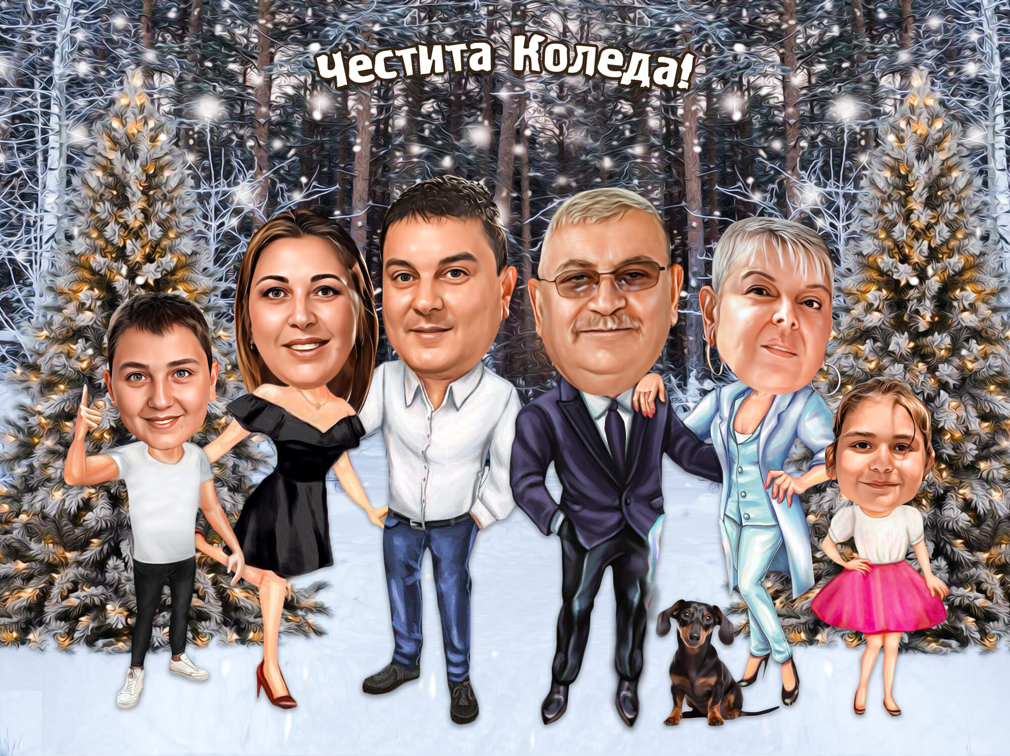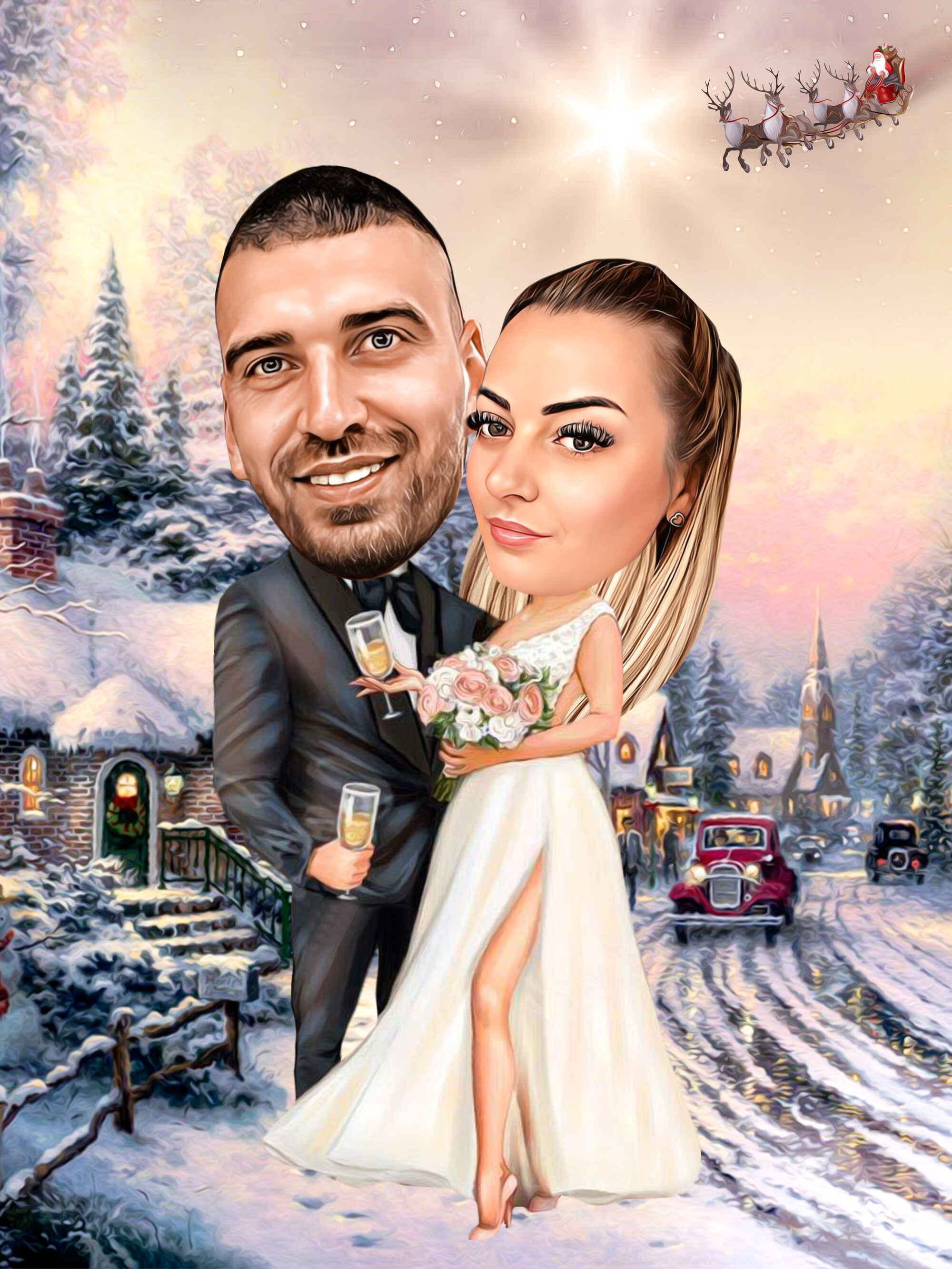 Коледна дигитална карикатура с до 3 лица, плюс магнит или коледна топка с готовата карикатура, от Stela Caricatures