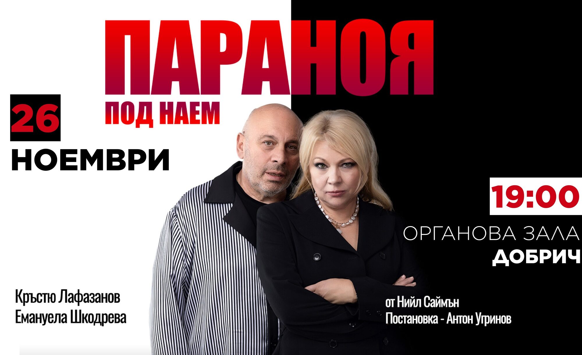 Кръстю Лафазанов и Емануела Шкодрева в "Параноя под наем" на 26 Ноември, в Концертна зала "Добрич"