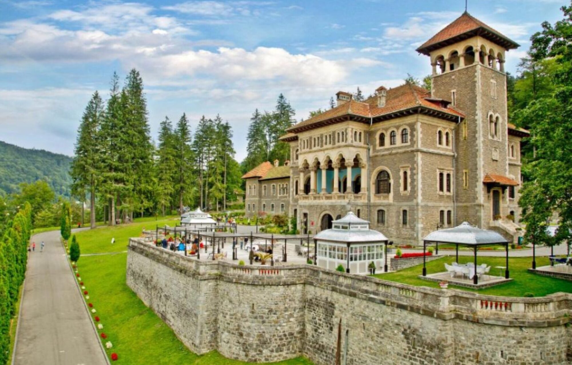 Вътрешността на замъка е с подчертано романтичен характер - римска мозайка, венециански стенописи, витражи от муранско стъкло, камини със златни листа, резбовани врати и тавани, мраморни стълби, бронзов обков с орнаменти, изработени в Париж, и парапети от ковано желязо. Централният павилион е украсен със стенописи върху кожа от Кордоба. Над главния вход се намира емблемата на семейство Кантакузино. От голямата каменна тераса се разкрива величествена гледка към планината Бучеджи и Кръста на героите на връх Караиман. В двора има ловна кула, фонтани и малка дървена църква, на чието освещаване през 1936 г. присъстват румънската кралица Мария и дъщеря ѝ Илеана. Допълнителна популярност замъкът придобива като снимачна локация на сериала "Wednesday".