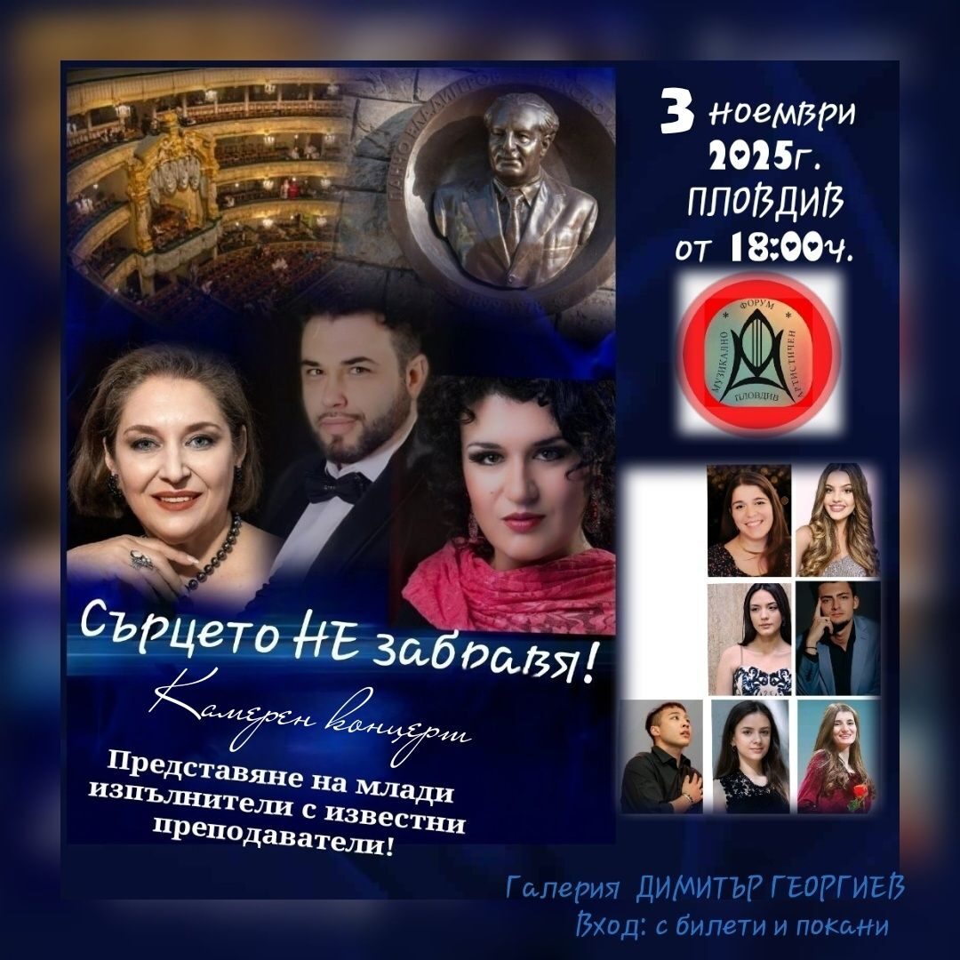 Представяне на млади изпълнители на известни преподаватели с камерен концерт "Сърцето НЕ забравя" - на 3 Ноември в Галерия "Димитър Георгиев", в Стария град
