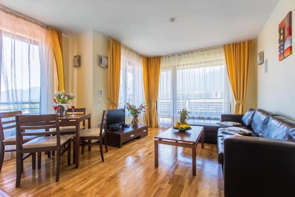 Този просторен апартамент се намира в сграда Азалия, основната сграда. Гостите на хотела, избрали да отседнат в Азалия имат удобен достъп до SPA центъра и заведенията и могат да се възползват от допълнителни услуги като рум сървис и мини бар. Всеки апартамент има две спални с общ хол с мека мебел, една или две бани с тоалетна и вана или душ, тераса, кухненски бокс с хладилник, котлони, фурна, абсорбатор и пералня, кана за чай/кафе.