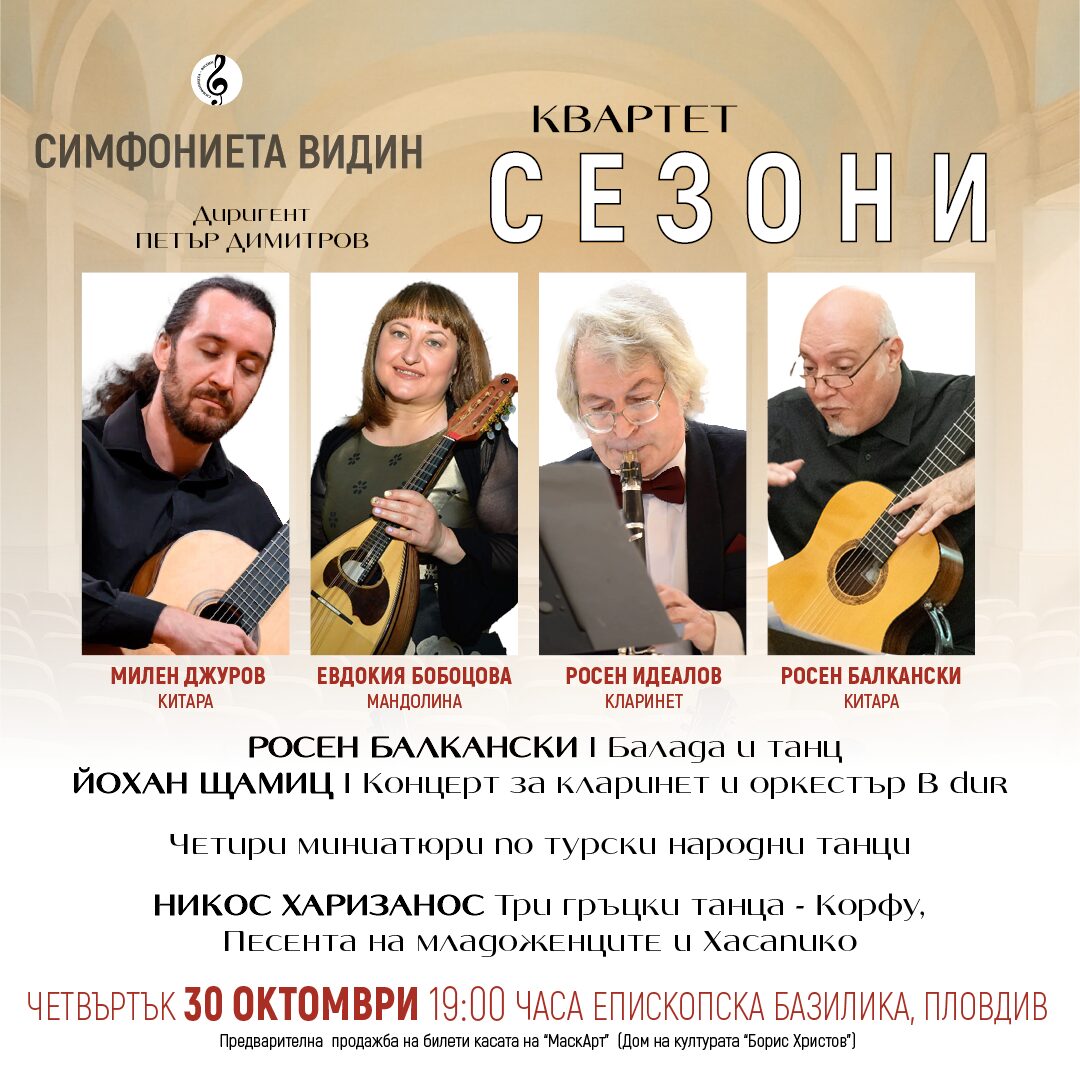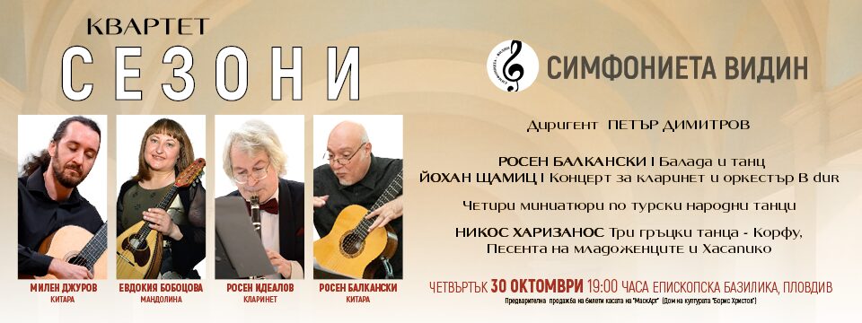 Симфониета Видин и признатият на международна сцена квартет "Сезони" в състав Евдокия Бобоцова - мандолина, Росен Идеалов - кларинет, Милен Джуров - класическа китара и Росен Балкански - класическа китара ви канят на един изключителен концерт, който преминава граници и епохи. Подгответе се за вълнуващо пътешествие от вечната чистота на класиката до колоритните ритми на Балканите, с ярък акцент върху съвременността!