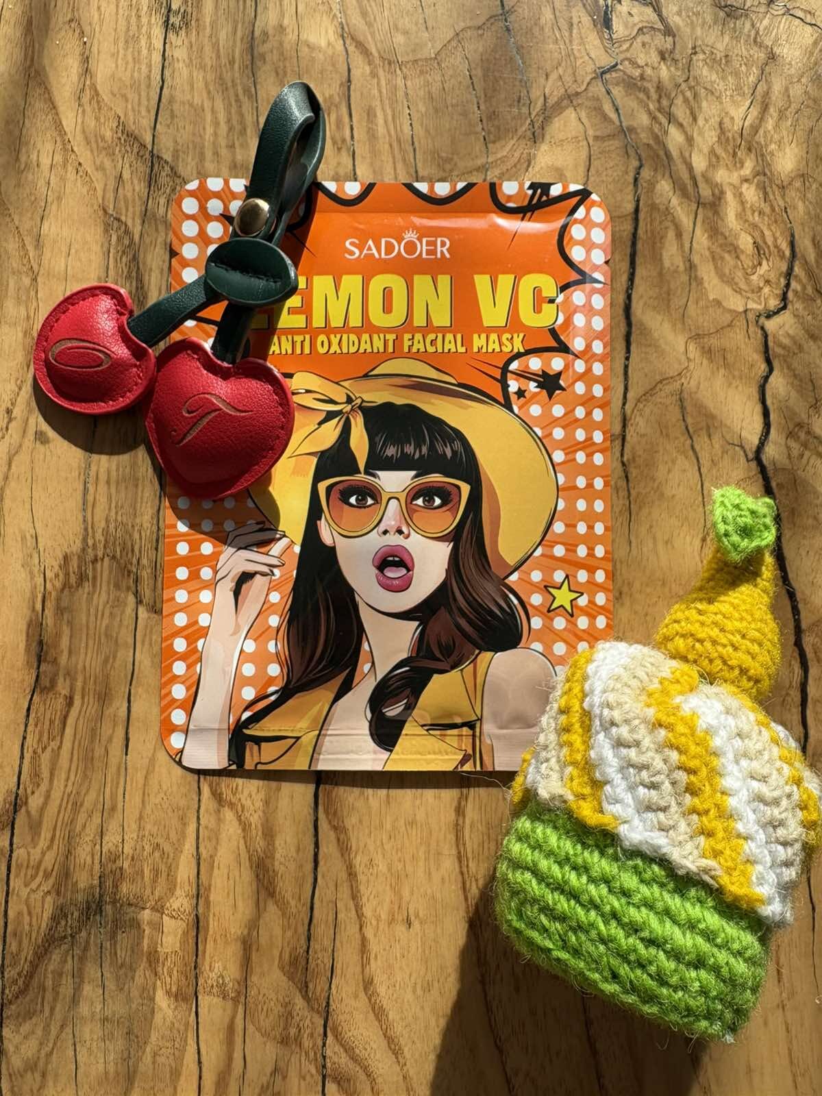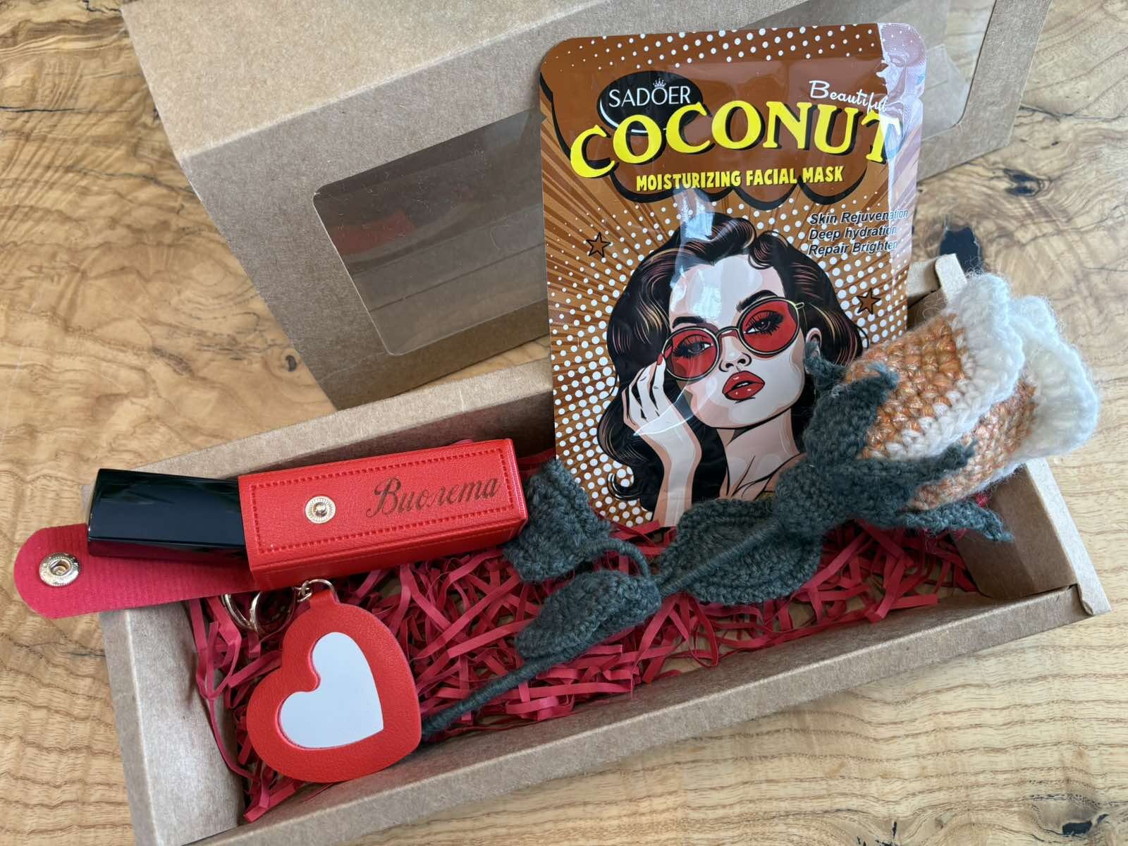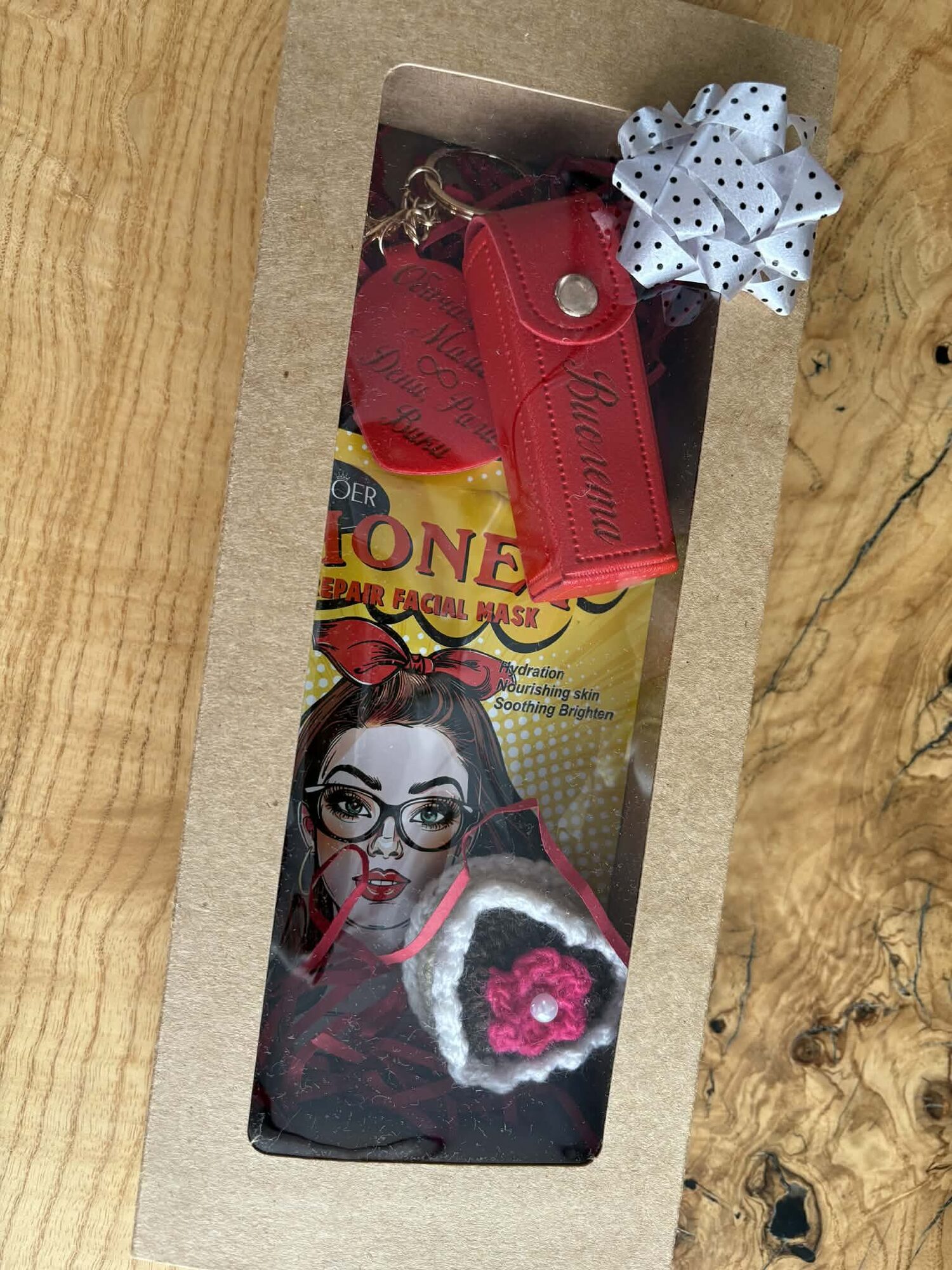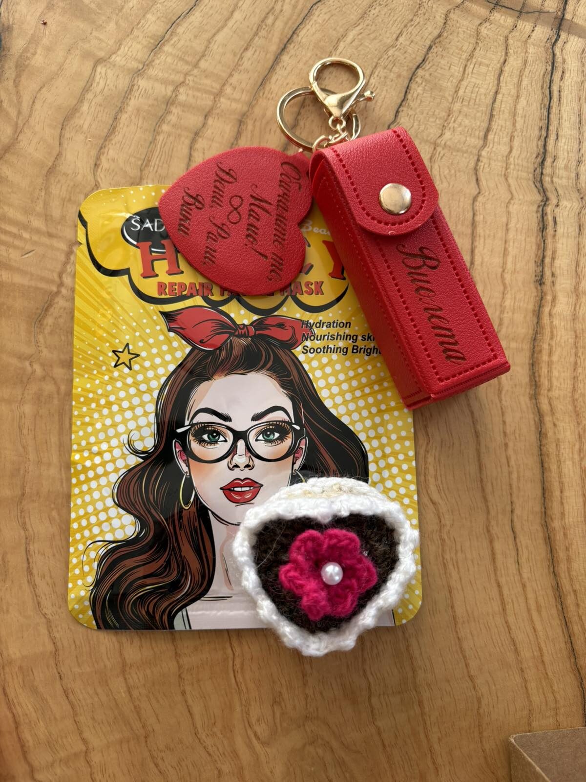 Кутия изненада персонализиран кожен калъф/ключодържател за червило, хиалуронова маска за лице и ръчно изплетен сладкиш: