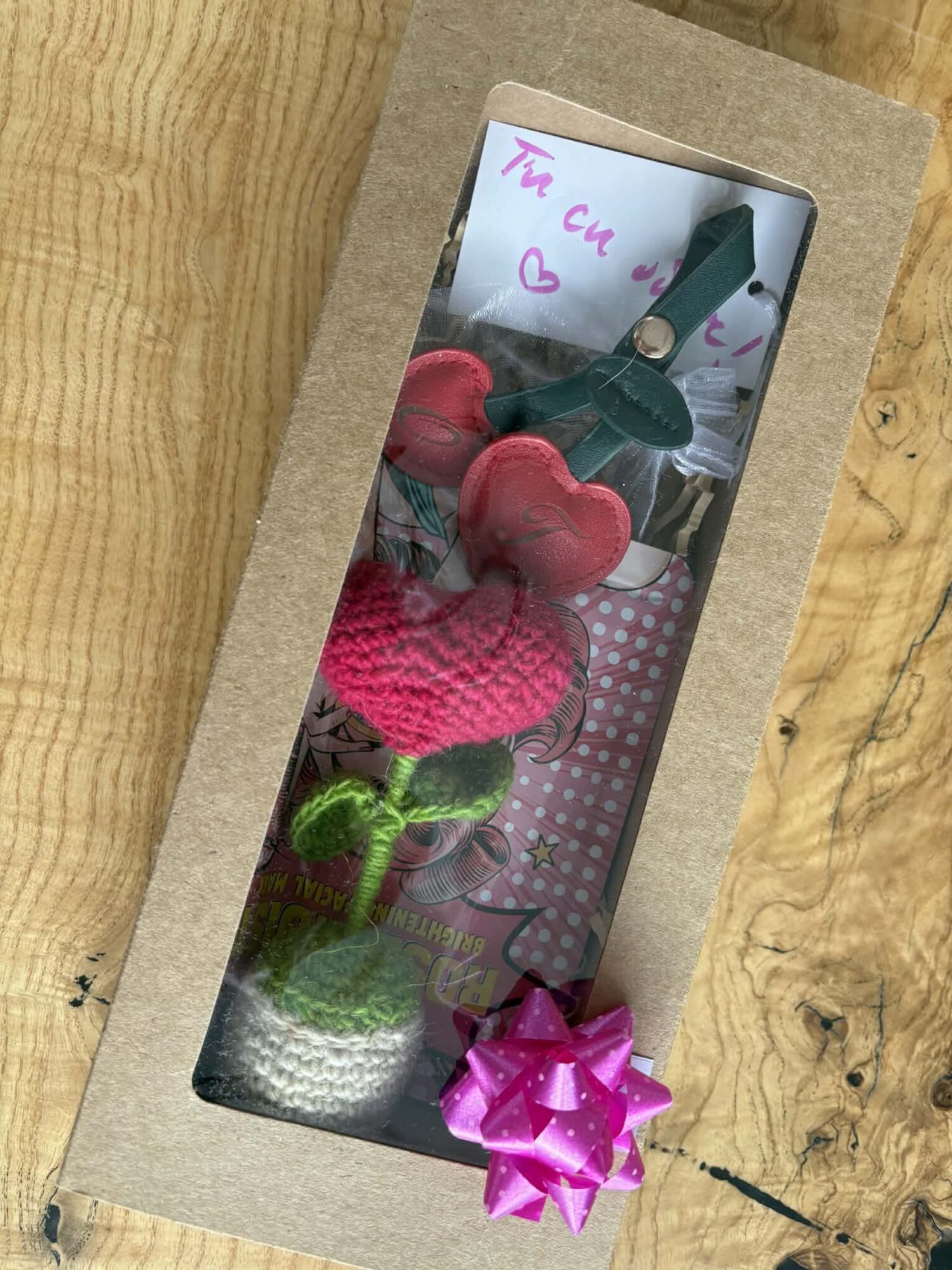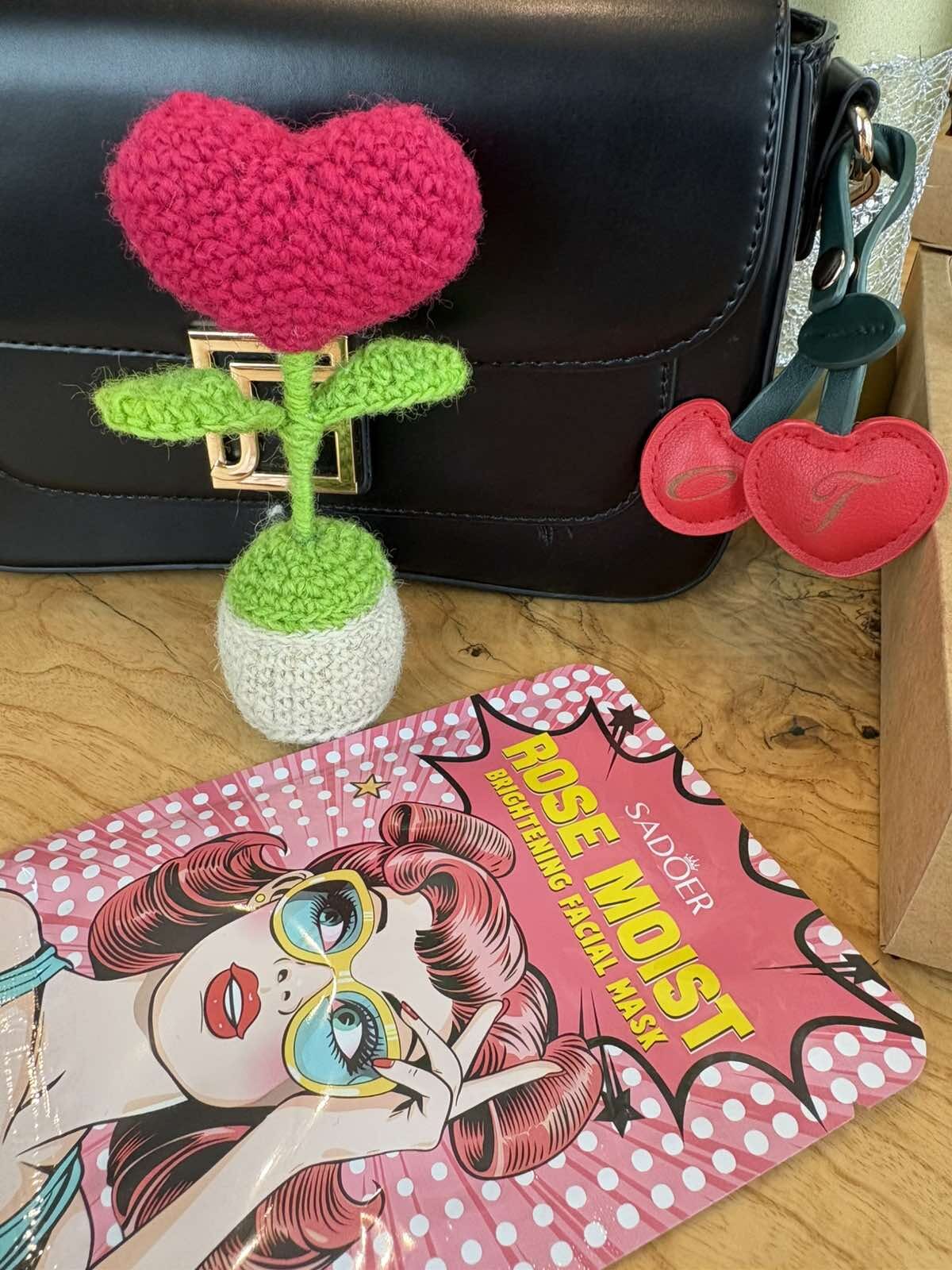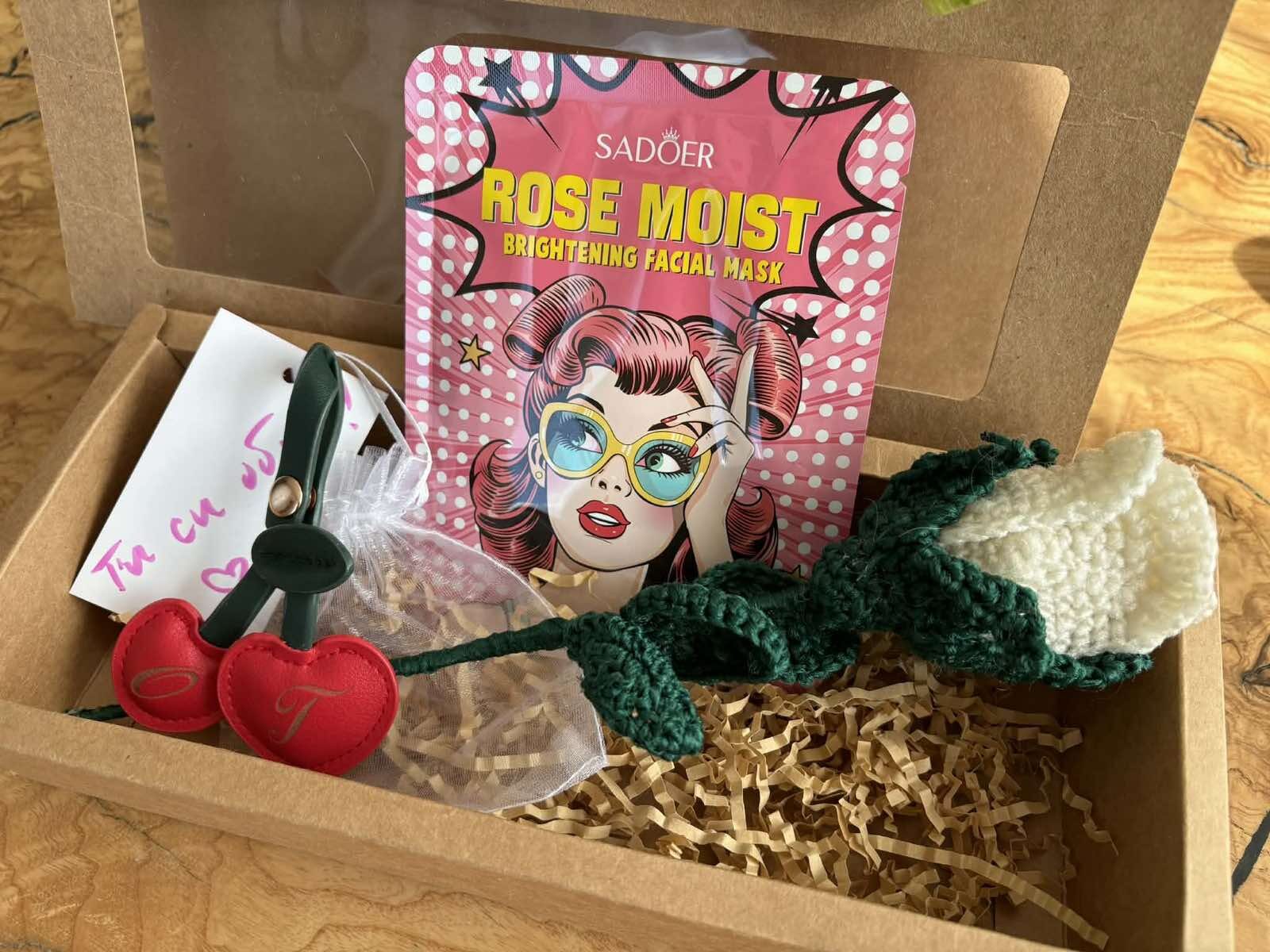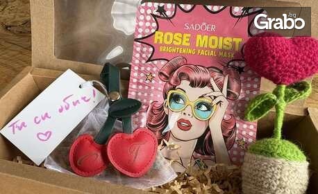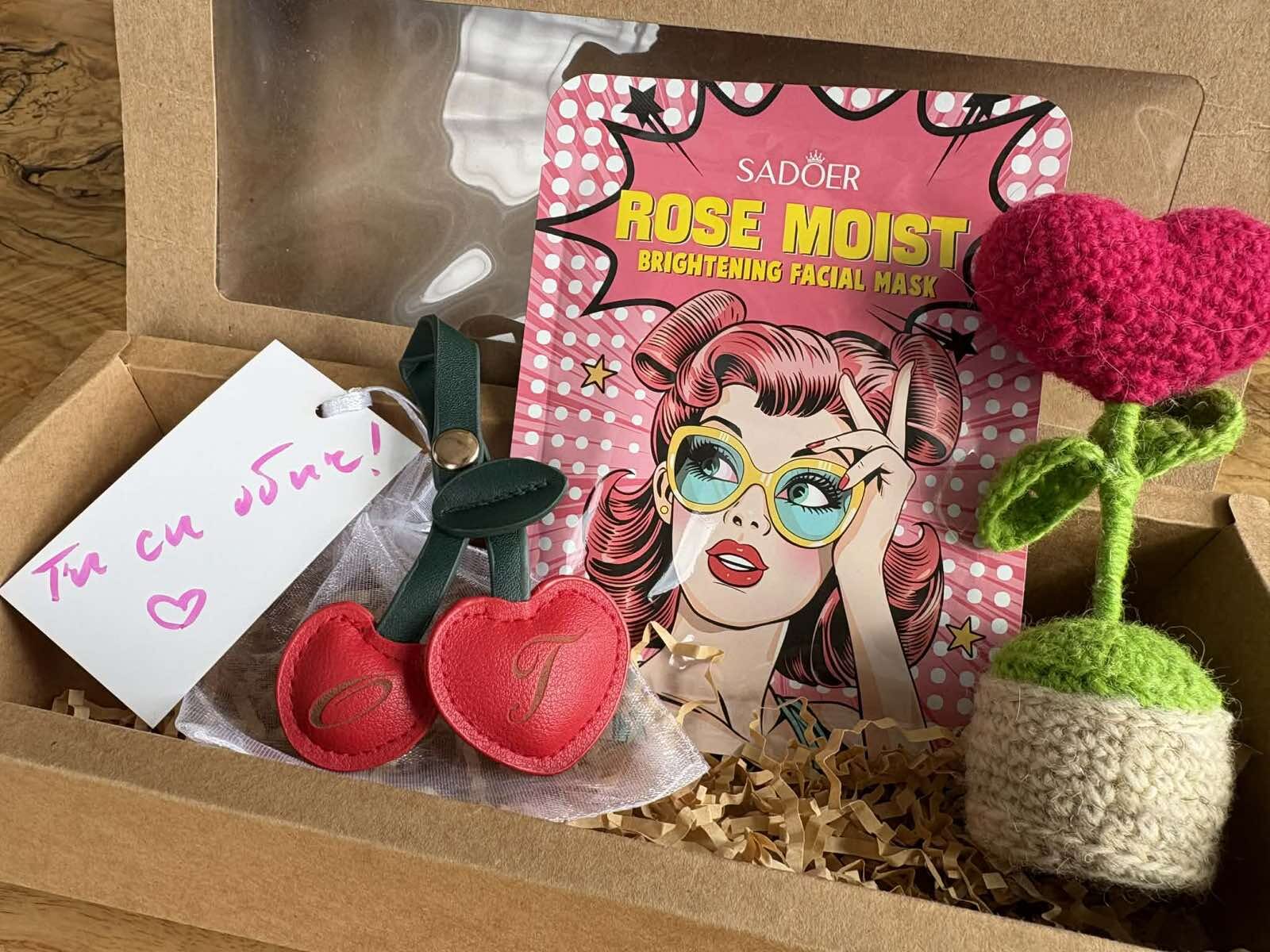 Кутия изненада персонализиран кожен аксесоар - прелестни черешки, хиалуронова мaска за лице - миг на нежност и грижа, ръчно изплетено сърце в саксия: