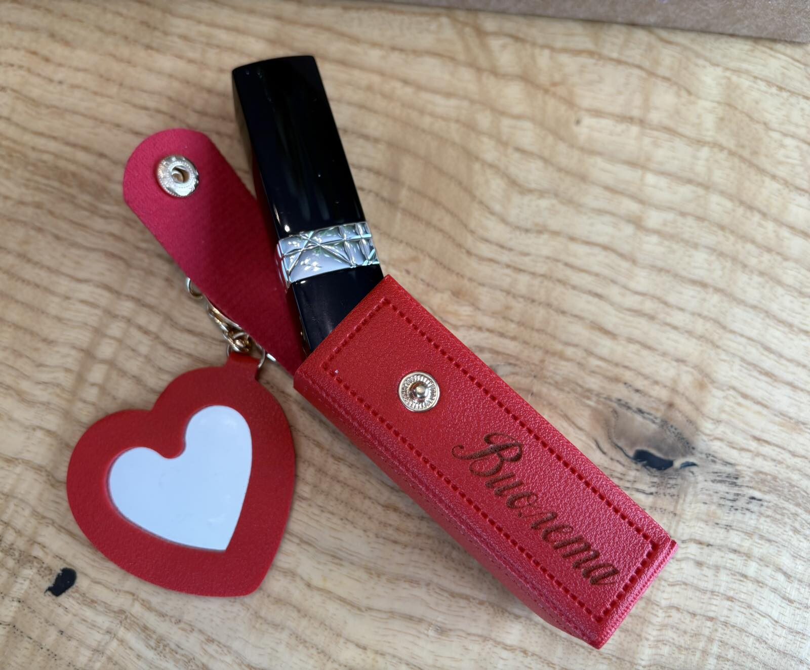 • Персонализиран кожен калъф/ключодържател за червило - гравиран с име и кратко пожелание на гърба на огледалото;