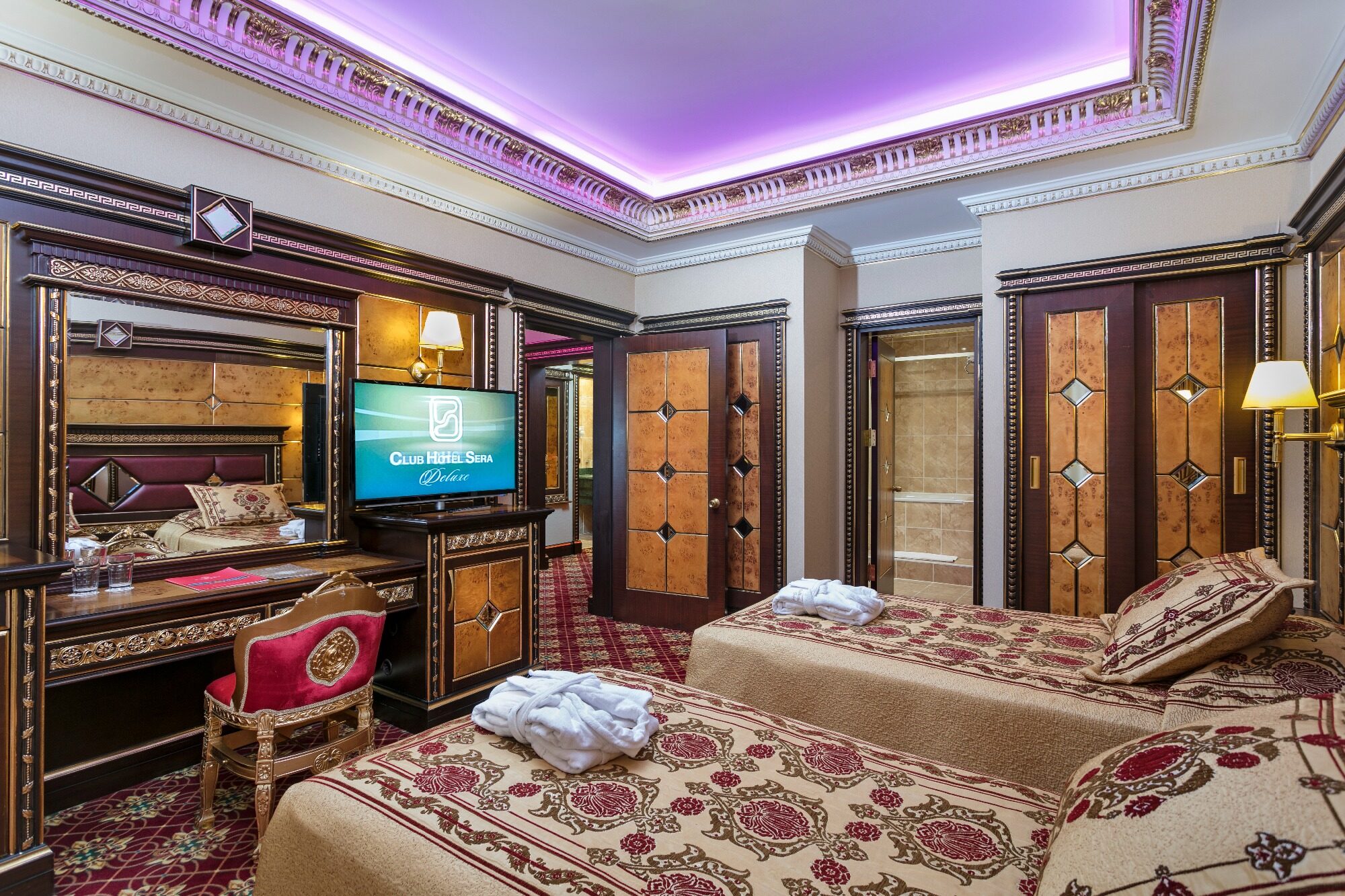 В стаите: Хотелът се състои от 5-етажна сграда Club Building, 13-етажна сграда Elegance Building и две 4- и 7-етажни сгради Park Sera Building. Хотелът разполага с 550 стаи с изглед към морето, градината и басейна.Стаите разполагат с централен климатик (в зависимост от метеорологичните условия), мини-бар (безалкохолни напитки, безплатно), сателитна телевизия с руски канал, Wi-Fi (заплаща се), телефон с директно избиране, вана или душ, сешоар, халат и чехли (при поискване), сейф (безплатно), балкон (някои стаи са с френски балкон), под - килим. Почистване на стаите - ежедневно, смяна на спално бельо - 3 пъти седмично.