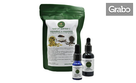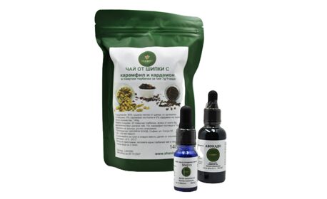 Етерично масло от бяла мирта (30мл) с базово масло от авокадо (30мл) и пакет ръчно пакетиран чай от шипкова люспа с кардамон и карамфил (140гр, 20 броя в пакет), в хартиена торбичка | 31.00 лв/15.85 € | Грабни |