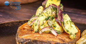 • Предястие - традиционна къпана баница, с топка разядка и лозови сарми и зелева сарма;