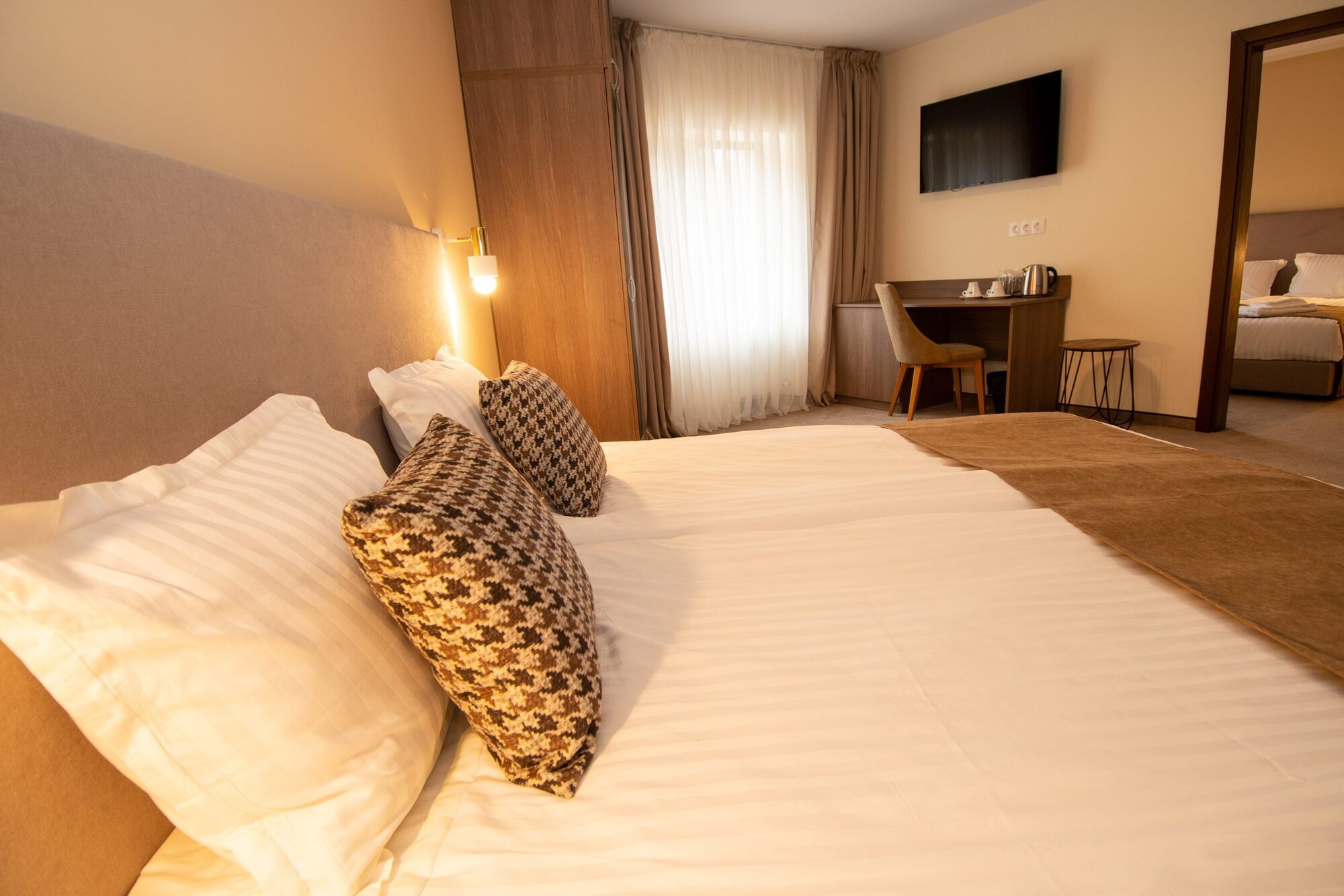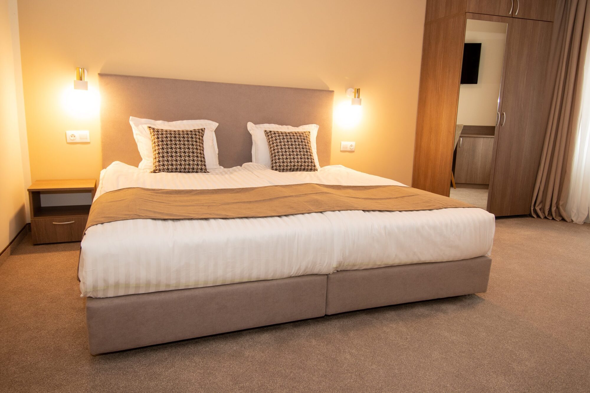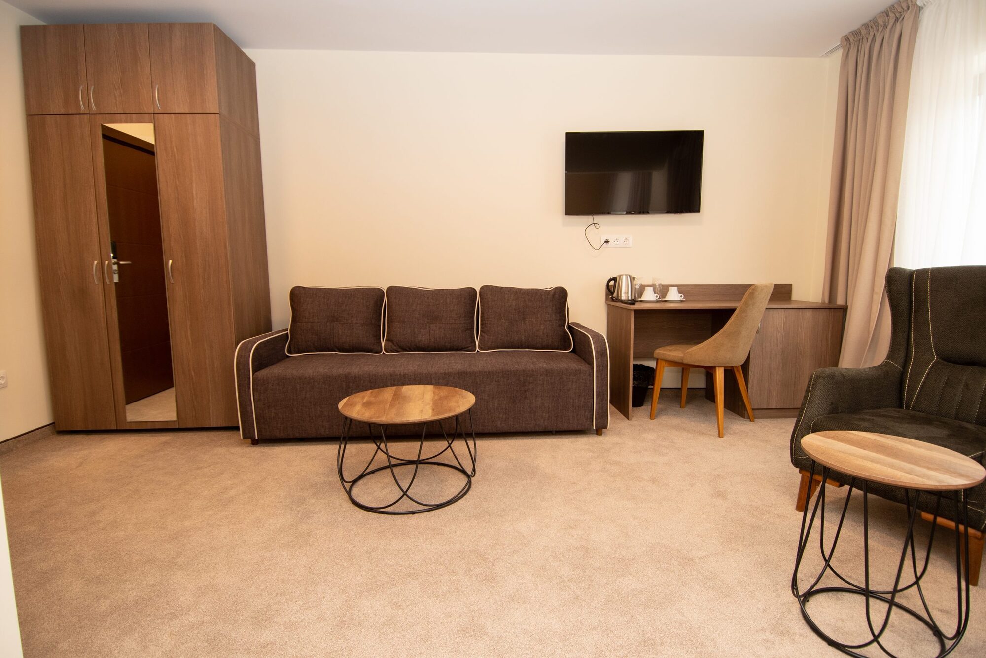 Едноспалните апартаменти (35 - 38 кв.м) се състоят от две помещения, като едното разполага с комфортна спалня и кът за сядане (разтегателен диван), а другото със спалня. Апартаментът разполага с една баня с тоалетна. Оборудване: телевизор с плосък екран (във всяка от стаите), писалище, гардероб, диван с холна маса, разтегателен диван), малък хладилник, централно отопление, кана за приготвяне на кафе и чай, сейф, Wi Fi. Баня: баня с параван, безплатни тоалетни принадлежности, сешоар, хавлиени кърпи.
