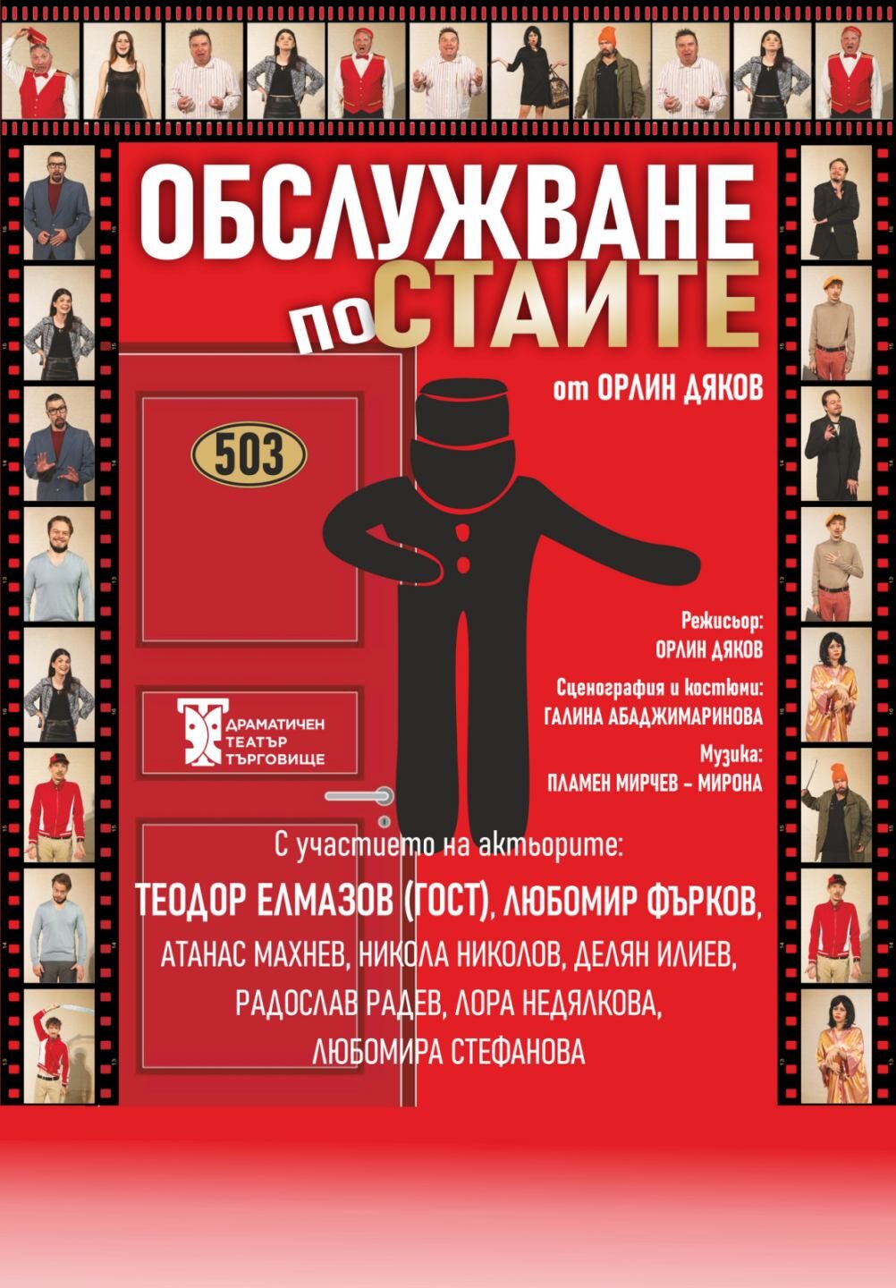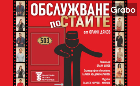 Семеен хотел в малко градче, в което голяма група учени са решили да проведат конгреса си. Целият хотел е зает освен стая 503, в която любезният хотелиер ще настани журналистка и известен артист, двама решили да се разведат, двама решили да изневерят, едно момче, което търси любовта и още плеяда от съвременни образи. Леглото в стаята е едно, нощите шест. Ще разберете какво ще се случи ако гледате комедията "Обслужване по стаите" с участието на Теодор Елмазов.