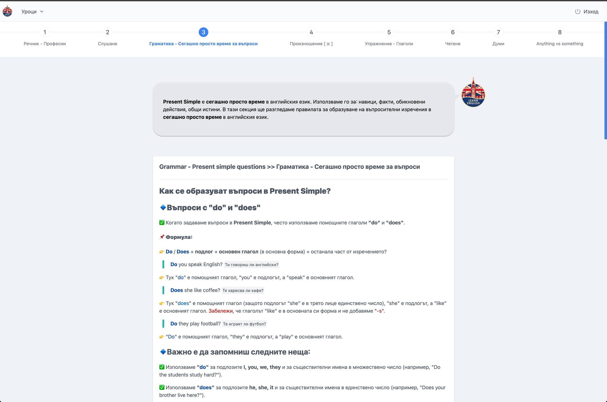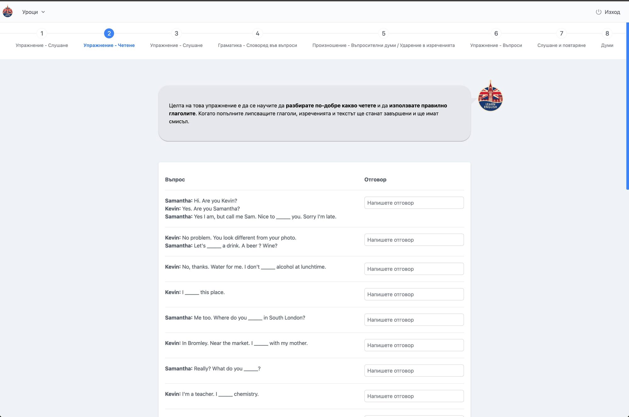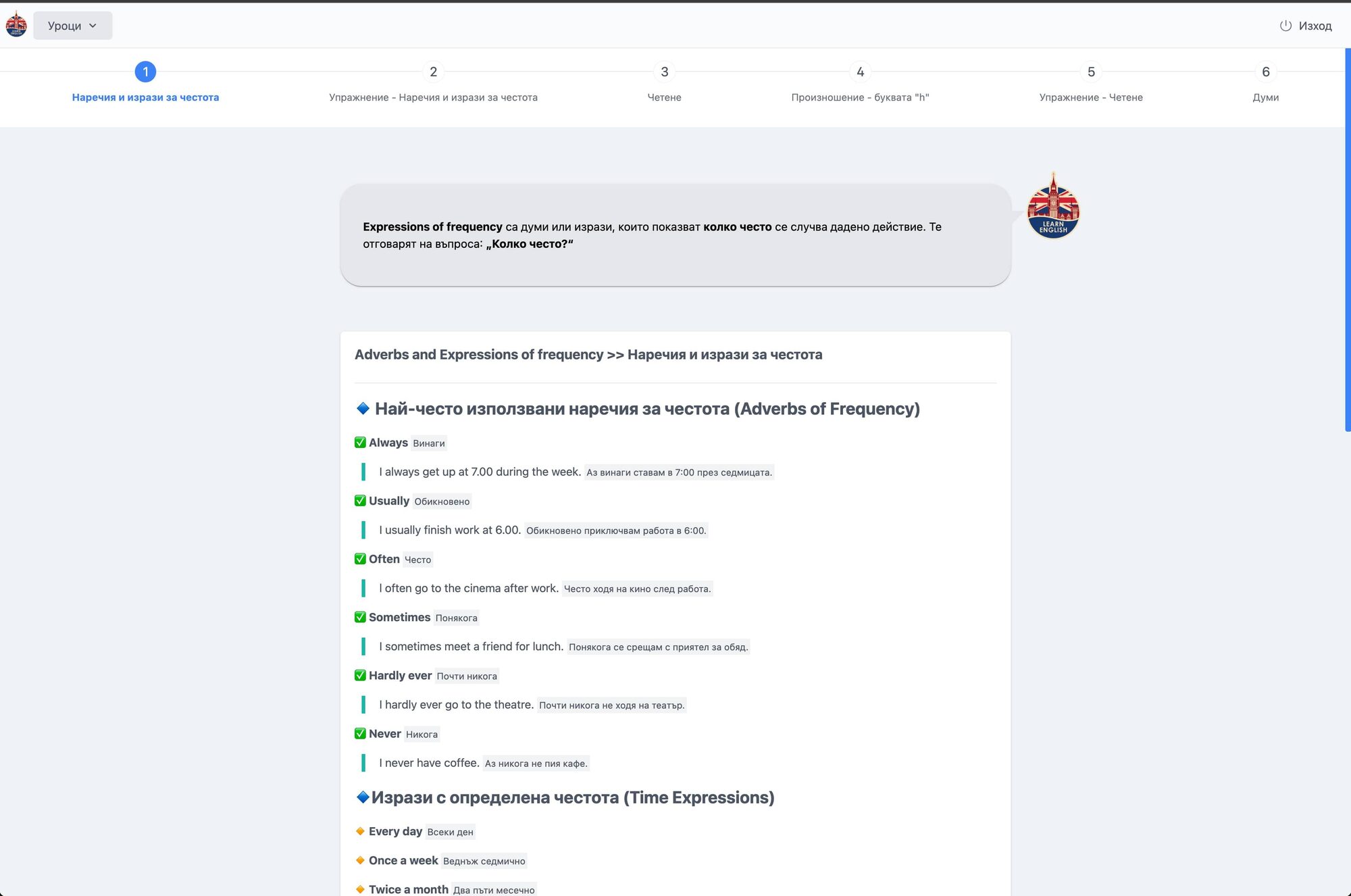 Платформата LearnEnglish е онлайн учебна среда, която предлага иновативен подход към изучаването на английски език, основан на методологията на Оксфордския университет. Тя е предназначена както за начинаещи, така и за напреднали ученици, като предоставя достъп до разнообразни учебни ресурси, включително интерактивни уроци, тестове, упражнения и видеоматериали. Основната цел на платформата е да подпомогне потребителите в развиването на езиковите им умения чрез практическо приложение на знанията в реални комуникационни ситуации.