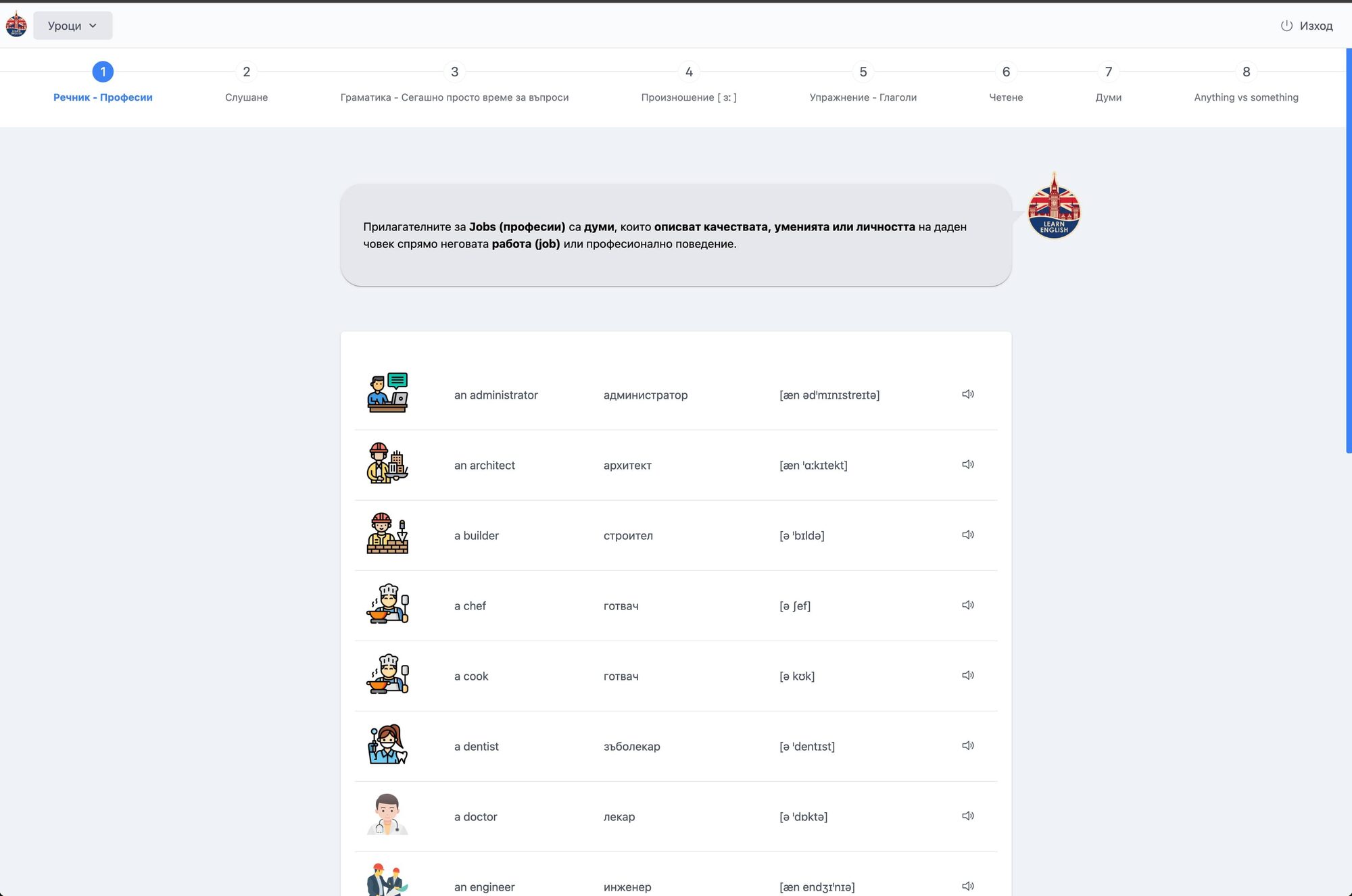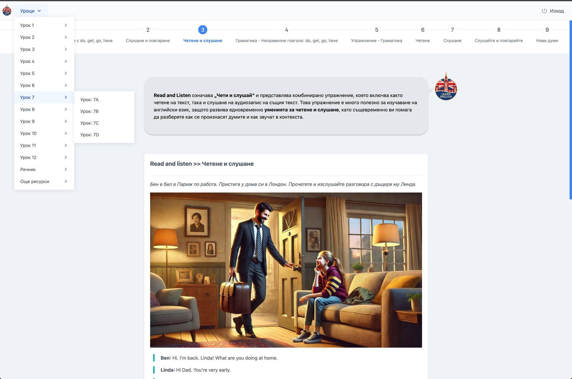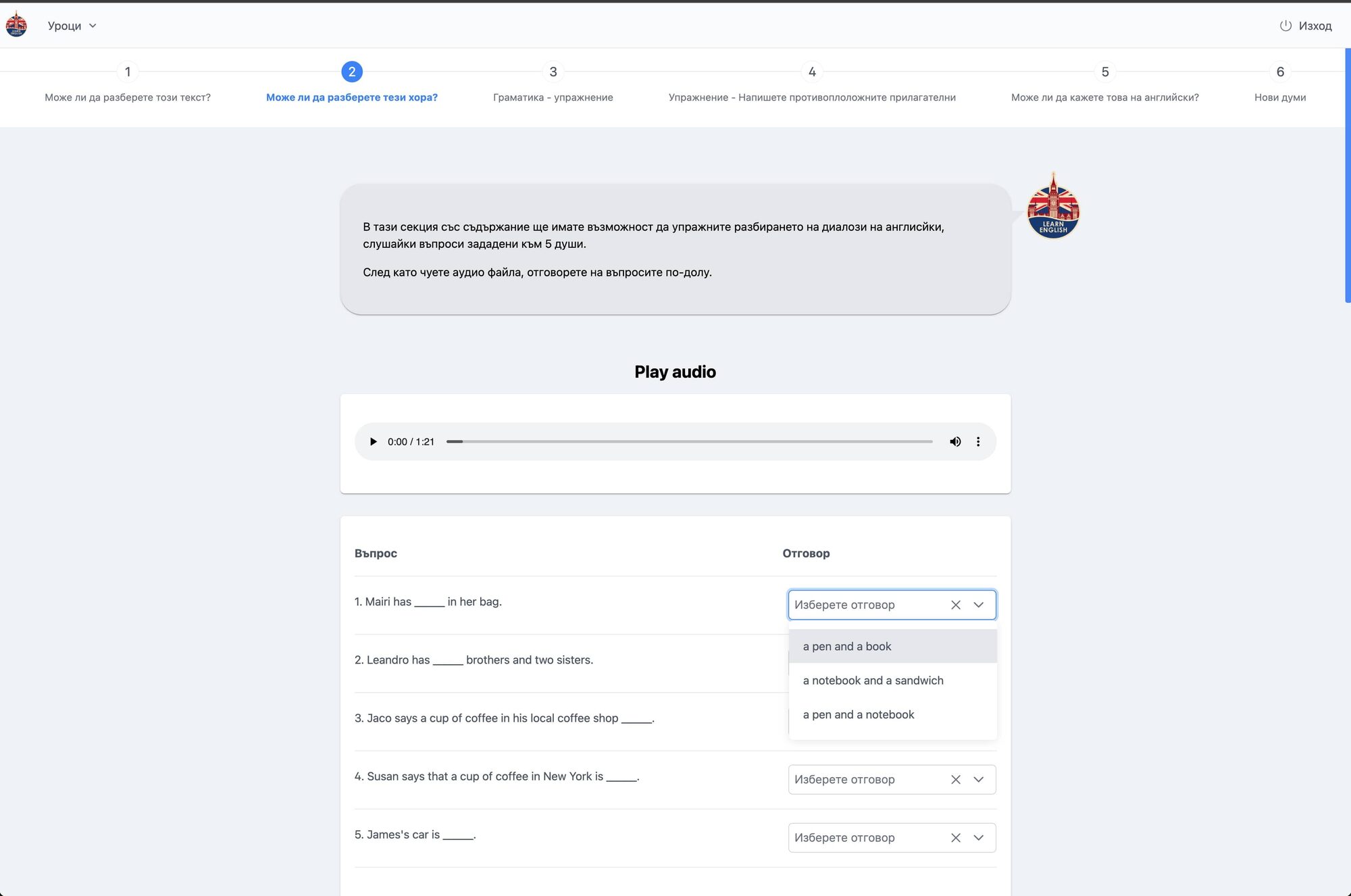Платформата LearnEnglish е онлайн учебна среда, която предлага иновативен подход към изучаването на английски език, основан на методологията на Оксфордския университет. Тя е предназначена както за начинаещи, така и за напреднали ученици, като предоставя достъп до разнообразни учебни ресурси, включително интерактивни уроци, тестове, упражнения и видеоматериали. Основната цел на платформата е да подпомогне потребителите в развиването на езиковите им умения чрез практическо приложение на знанията в реални комуникационни ситуации.