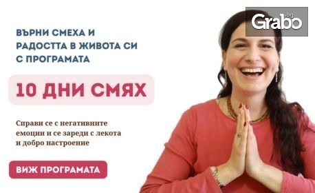 | Онлайн програма "10 Дни Смях" | 30.00 €/58.67 лв | Грабни |