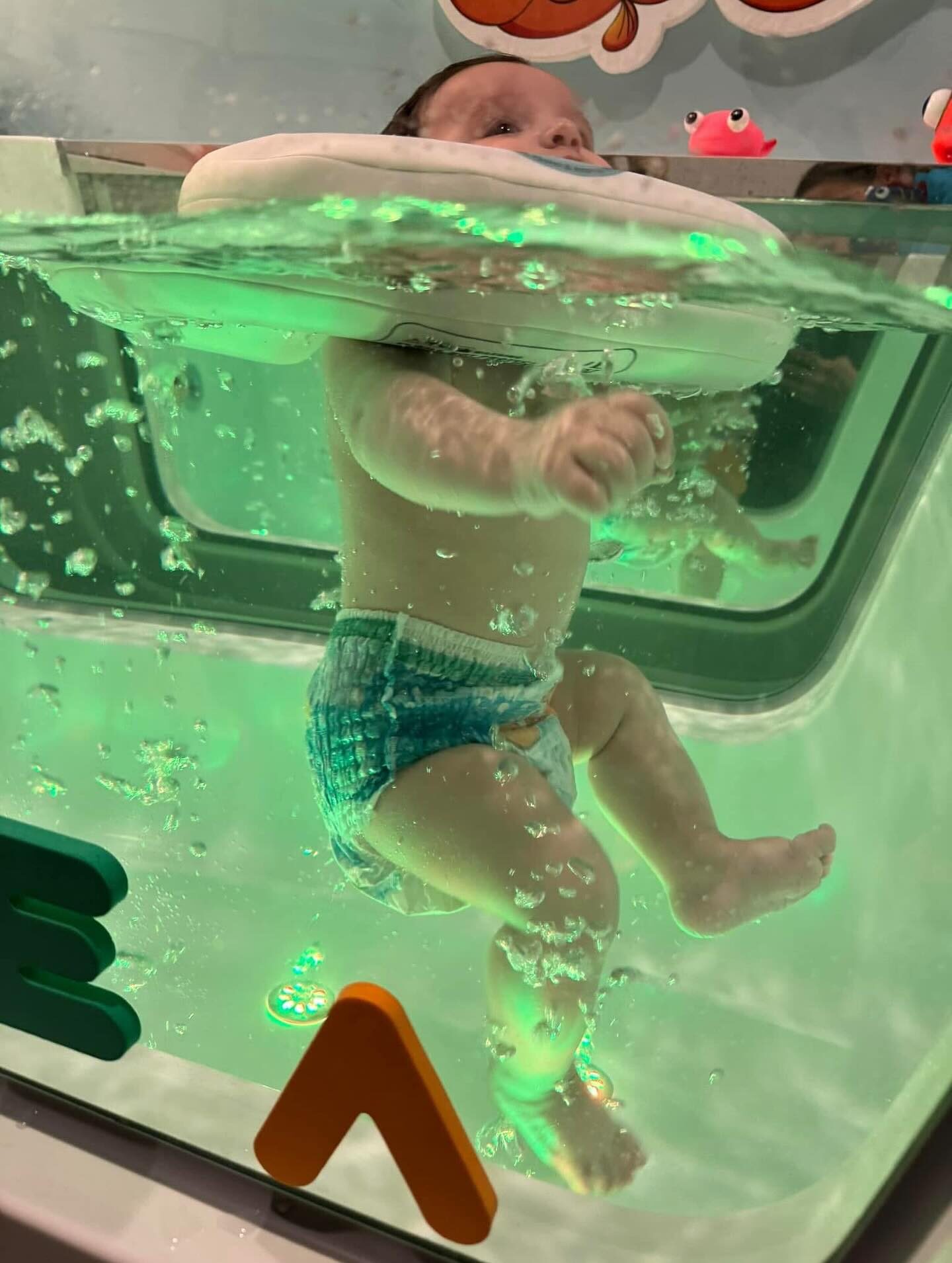 Събличате вашето бебе на масата за преобуване и му поставяте банските, които ви предоставяме на място. След това се поставя якатa за плаване, която е напълно безопасна и удобна.