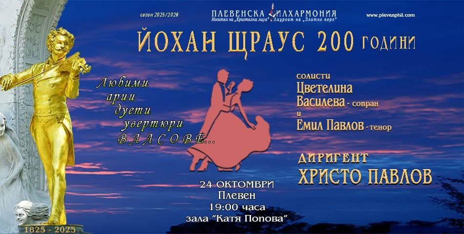 Плевенска филхармония ви кани на концерт по случай 200 години от рождението на Йохан Щраус: Концерт със солисти Цветелина Василева и Емил Павлов на 24 Октомври, в Зала "Катя Попова"