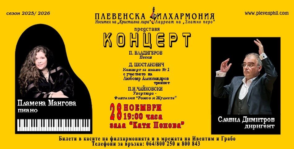 Плевенска филхармония представя концерт със солист Пламена Мангова - пиано и диригент Славил Димитров на 28 Ноември, в зала "Катя Попова"