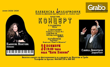 | Концерт със солист Пламена Мангова - пиано и диригент Славил Димитров на 28 Ноември от 19:00ч, в зала "Катя Попова" | 20.00 лв/10.23 € | Грабни |