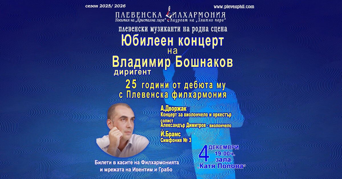 Плевенска филхармония представя концерт от поредицата "Плевенски музиканти на родна сцена" с маестро Владимир Бошнаковна на 4 Декември, в Зала "Катя Попова"