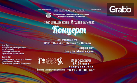 | Симфоничен концерт "Звук, цвят, движение, хармония" на 18 Ноември от 19:00ч, в Зала "Катя Попова" | 15.00 лв/7.67 € | Грабни |