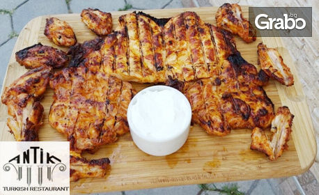 Апетитно! Обезкостено пиле и шиш пилешки крила на дървени въглища, плюс чеснов сос, от Ресторант Антик