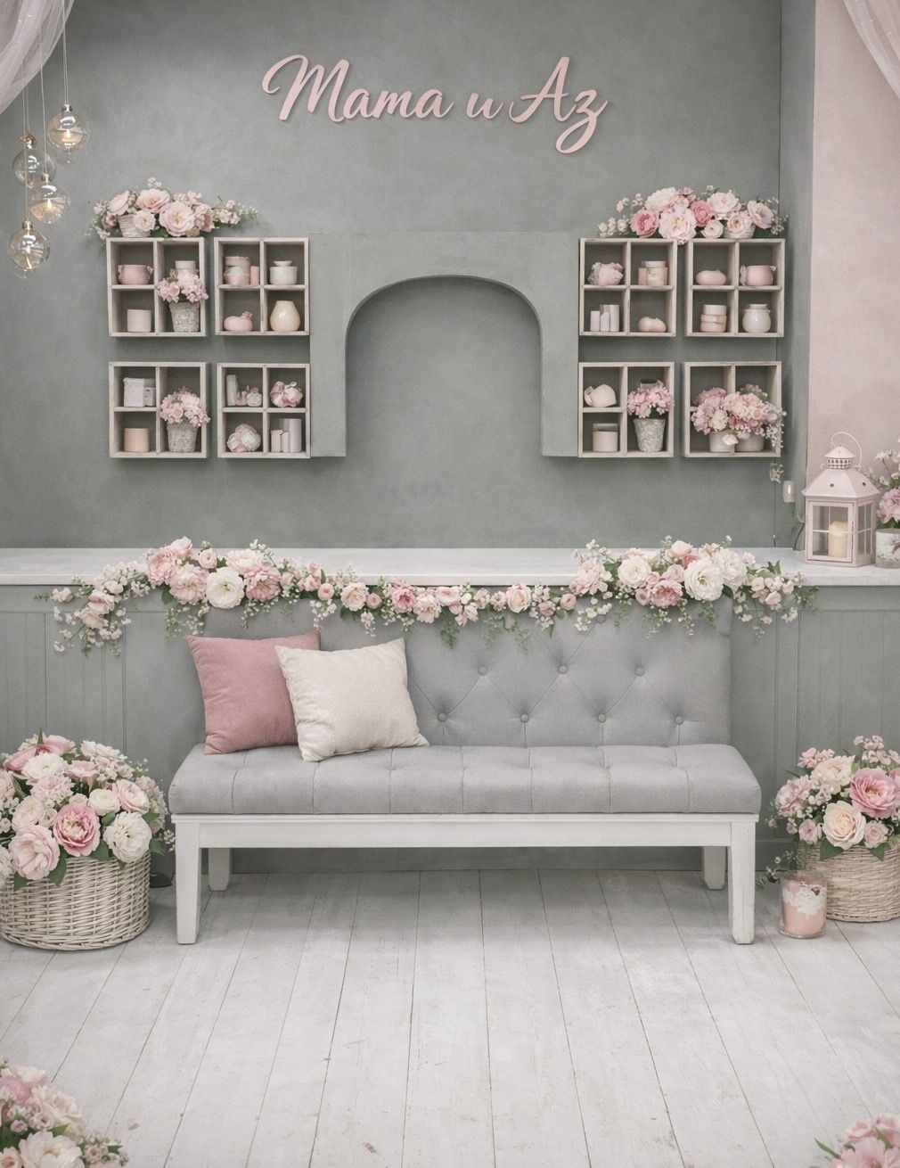 Фотосесиите се провеждат в студио с пролетна атмосфера и уютна декорация. Показаната визия е концептуална и създадена с помощта на изкуствен интелект - тя служи като вдъхновение за стил, цветове и настроение. Реалният декор ще бъде изработен в студиото и максимално близък като усещане, но адаптиран спрямо пространството.