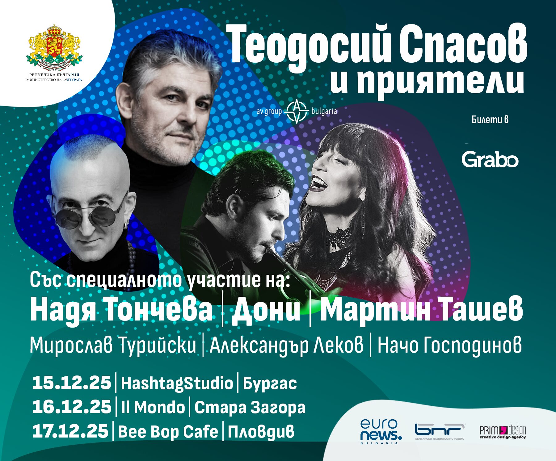 След възпламеняващите концерти в София на музикалния проект "Теодосий Спасов и приятели" дойде моментът за турне в страната. Маестро Теодосий Спасов е известен със своите оригинални идеи, за осъществяването на които събира световни музиканти от различни жанрове.