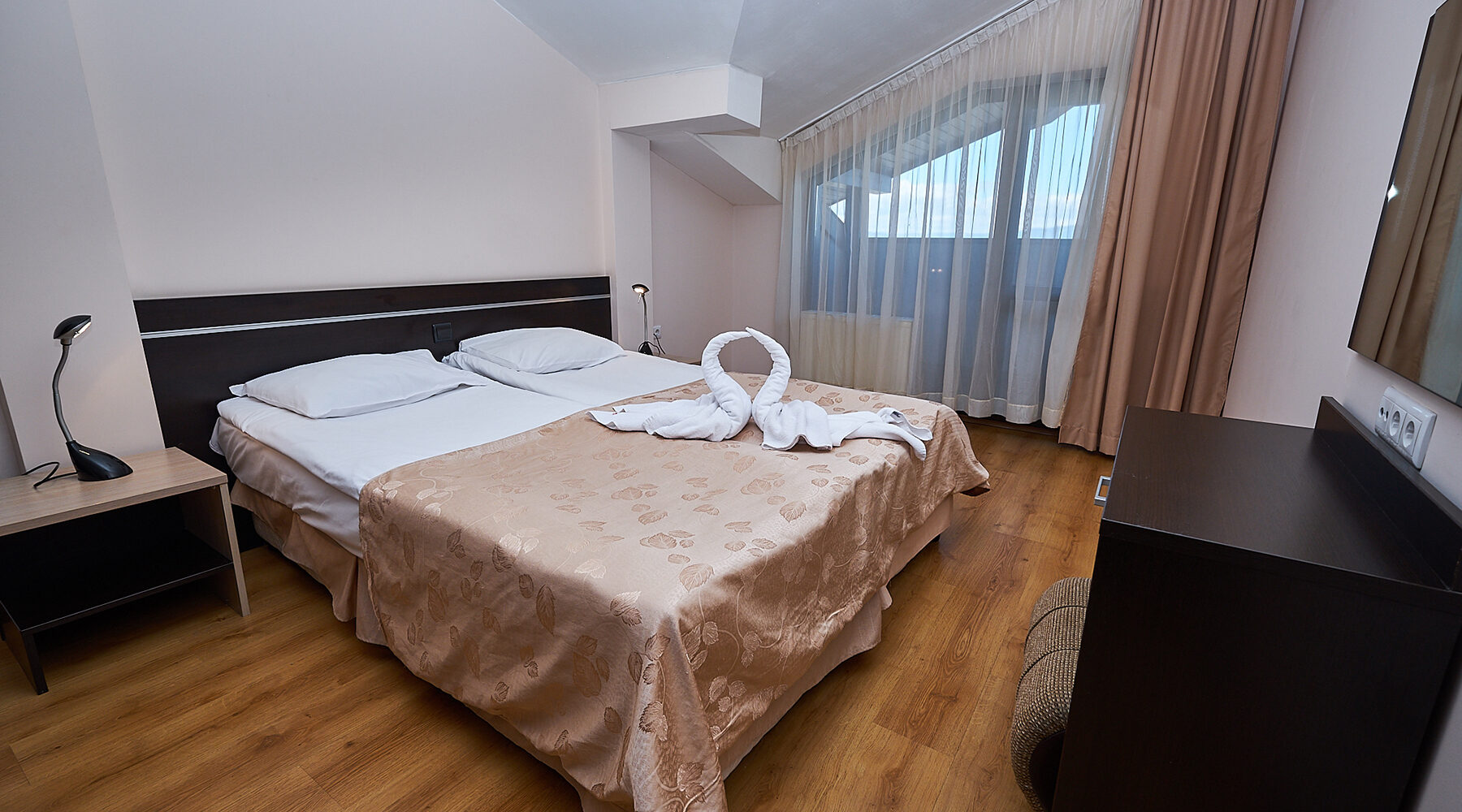Двуспален апартамент - всекидневна и 2 отделни спални с две единични легла врати отделящи помещенията; необорудвана кухня (котлони, хладилник, готвенето не е позволено); кабелна телевизия; мини-бар (безплатно само за деня на пристигане (минерална вода, кафе и чай); кана за топла вода; Wi-Fi (безплатно); баня с душ (душ кабина), сешоар, кърпи; почистване на стаите - ежедневно; смяна на спално бельо - на всеки 3 дни; смяна на хавлии - на всеки 2 дни; допълнително легло (разтегателен диван).
