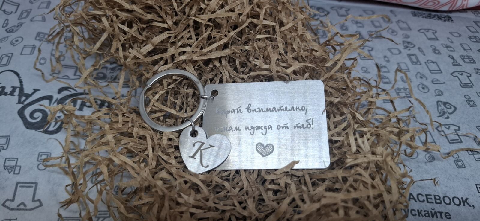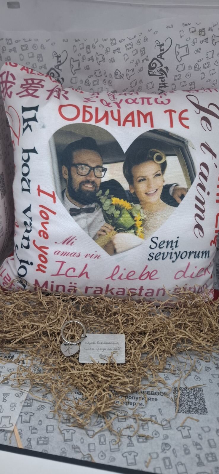 Подари любим спомен! Персонализиран комплект от възглавничка с Ваша снимка, плюс метален ключодържател с послание "Карай внимателно, имам нужда от теб" с Ваши инициали, от WildArt Workshop