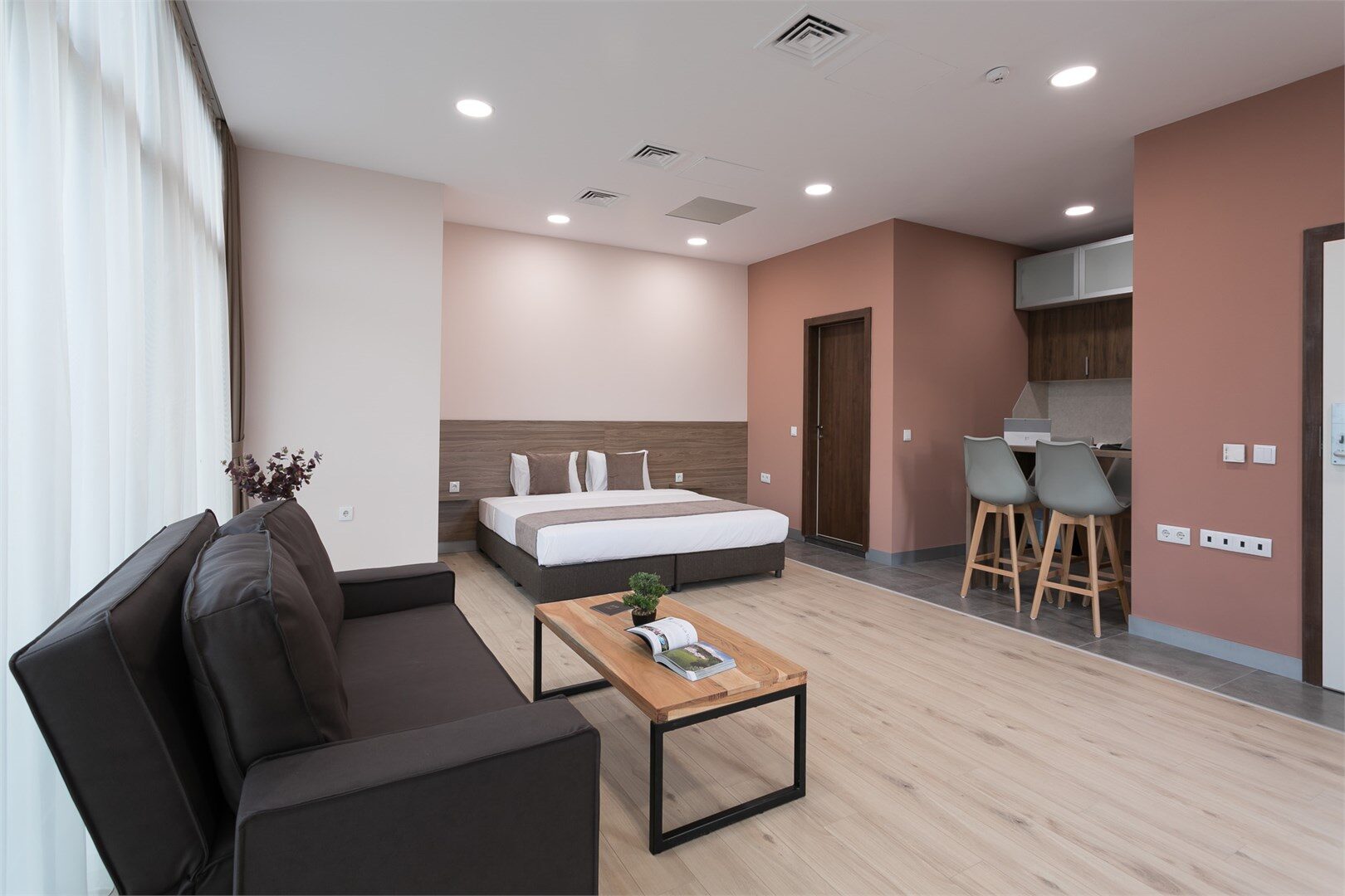 Студио: Оборудвано е с кухня и хол с разтегателен диван, студио Делукс прави перфектния дом далеч от дома в сърцето на София -идеален за работа, забавление и почивка.