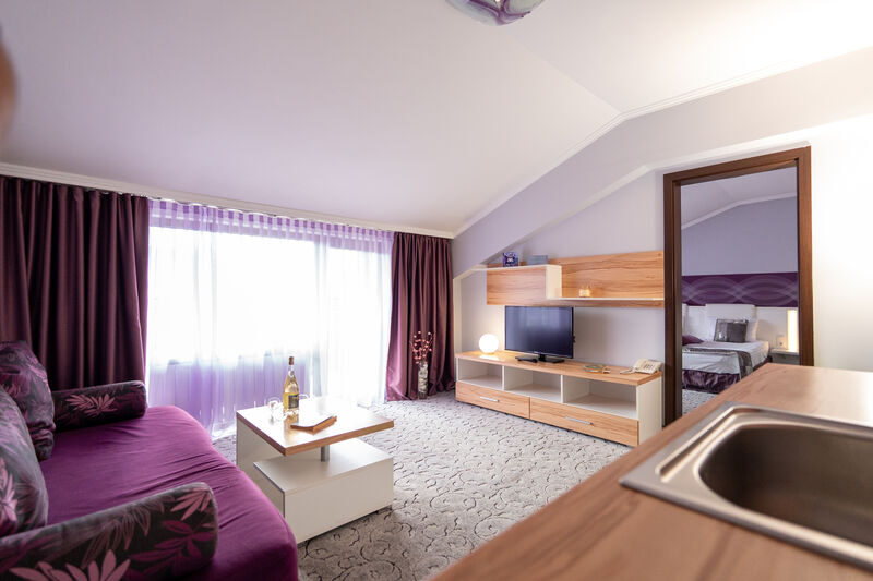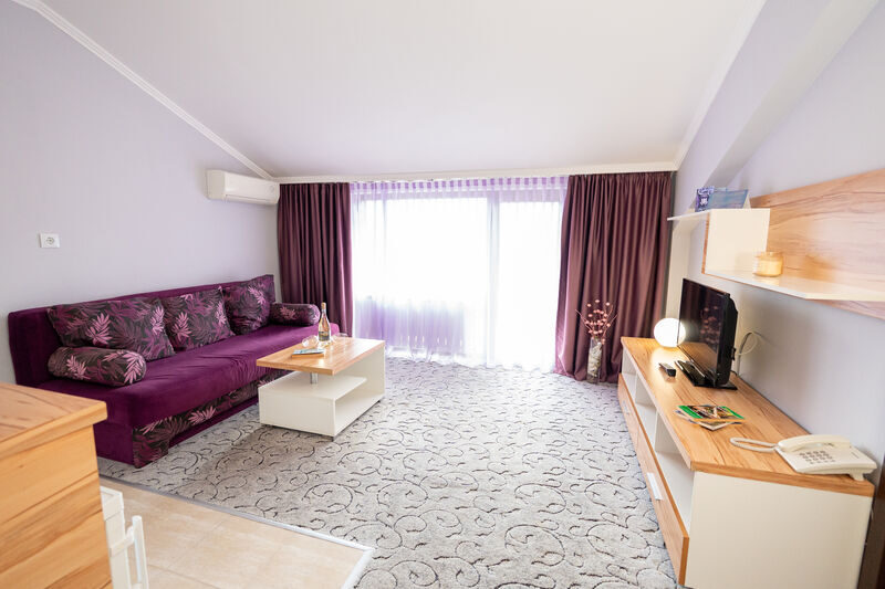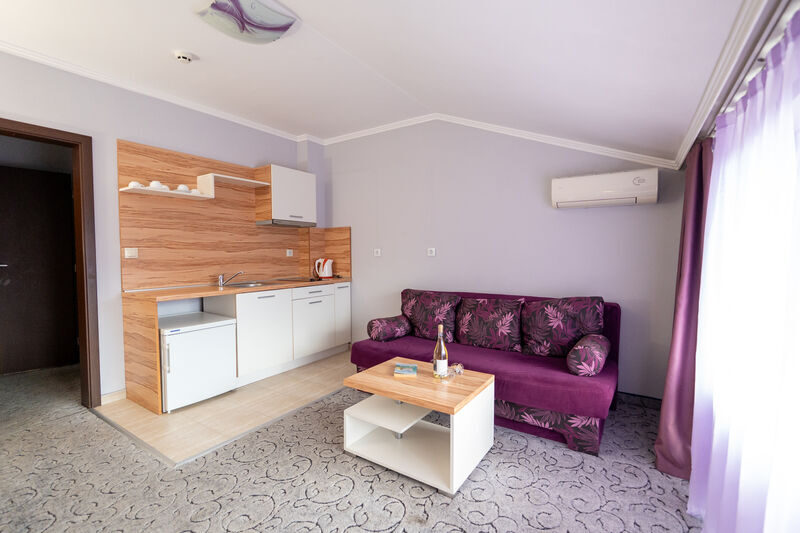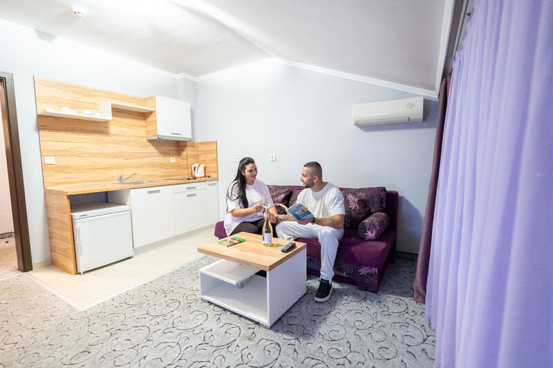 Едноспалният апартамент разполага със спалня с двойно легло и хол с разтегателен диван. Максимален капацитет: трима възрастни или двама възрастни с две деца.