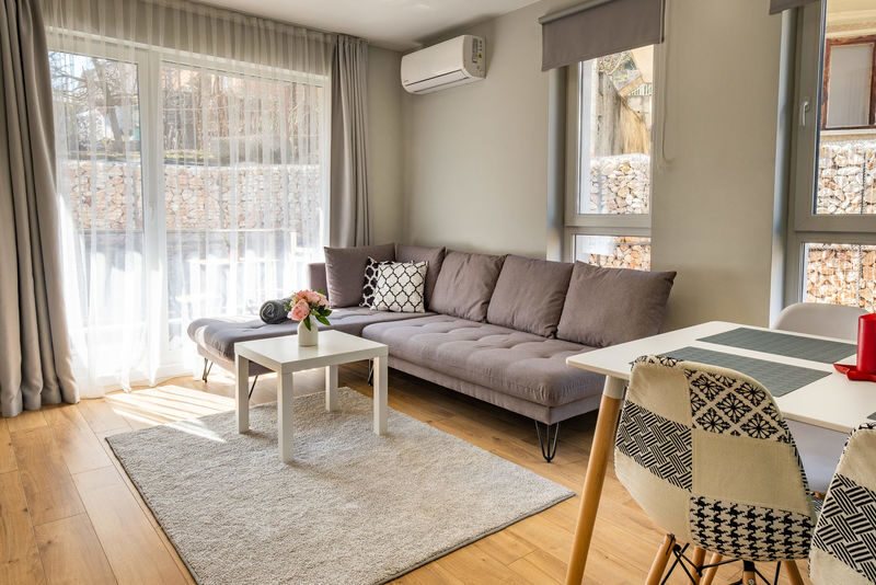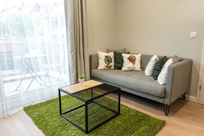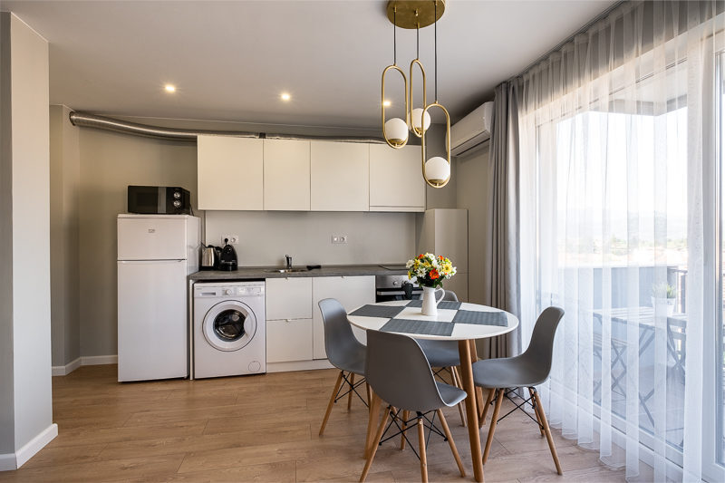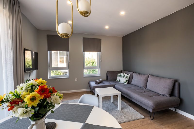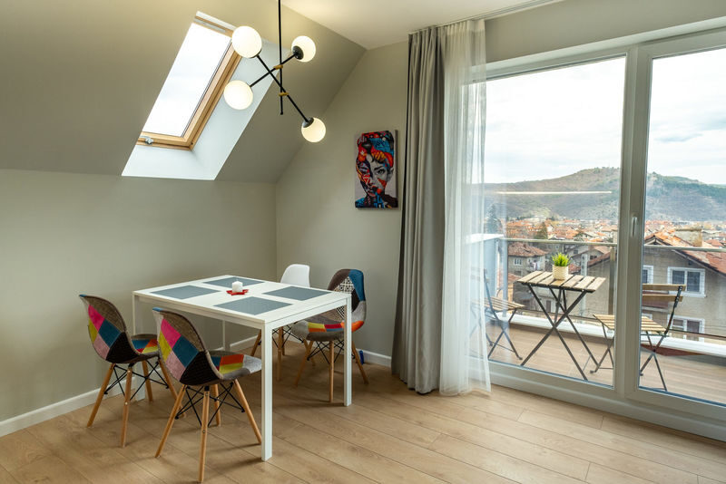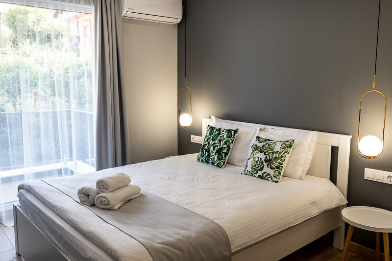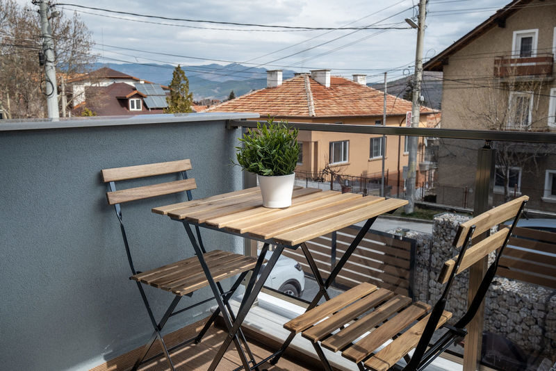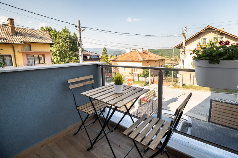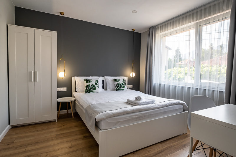 Разполага с площ от 60кв.м, разпределени в две стаи - дневна с комфортен диван, 55-инчов телевизор с цифрова телевизия с 300 канала, трапезария, напълно оборудвана кухня (кафе машина и кафе, чай, захар, посуда, котлон, абсорбатор, кана за чай), климатик, тераса с външна мебел, баня с тоалетна, антре, спалня с матрак от мемори пяна, гардероб, ютия и дъска за гладене, сешоар, бюро (подходящо за работа) и конвектор.