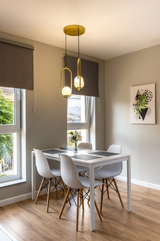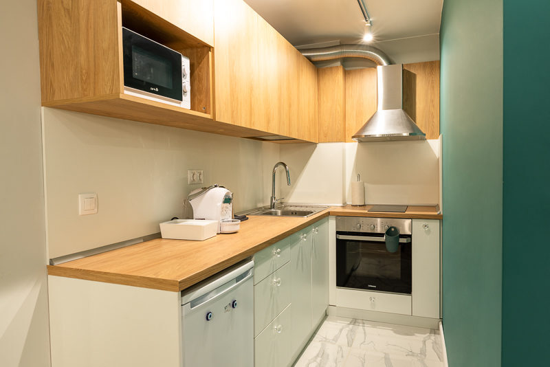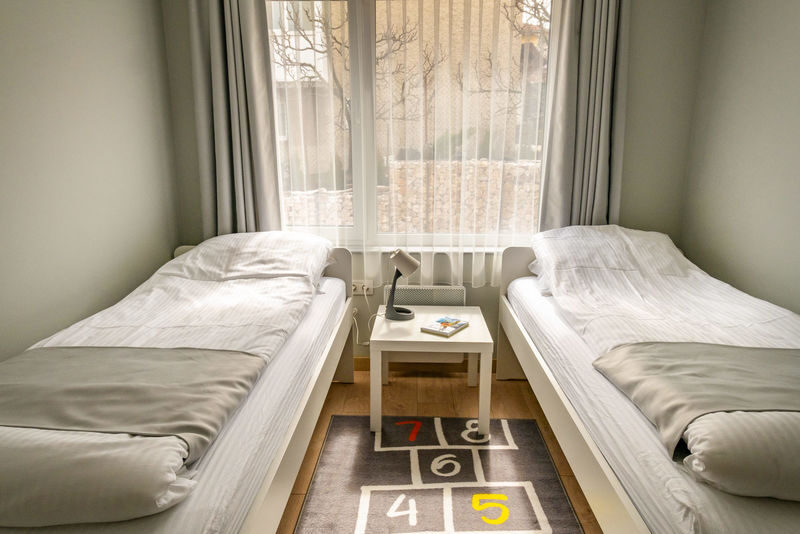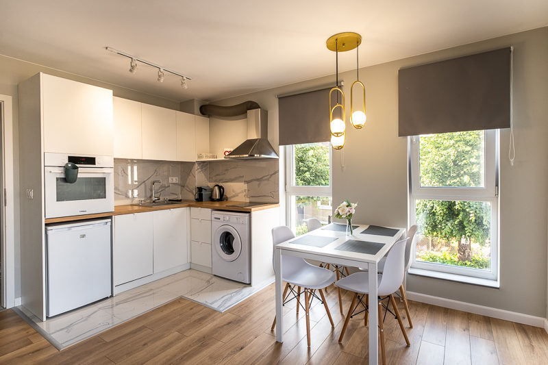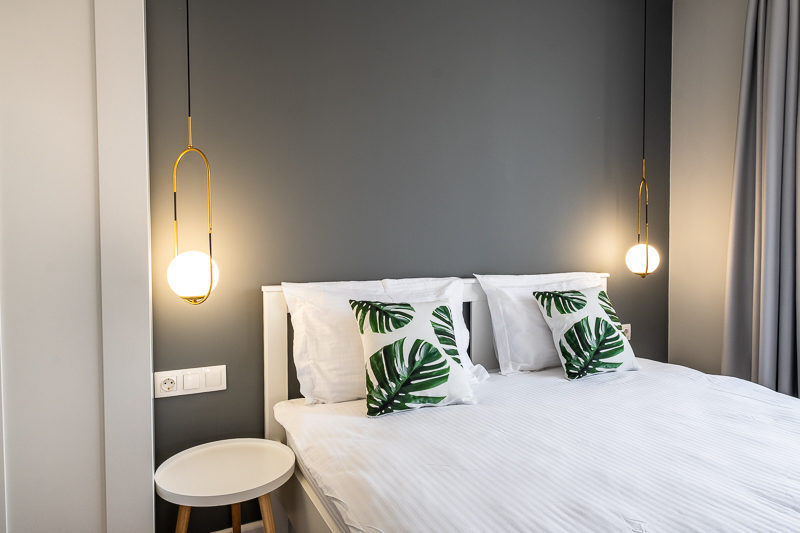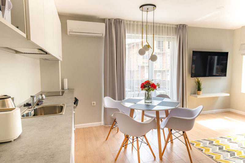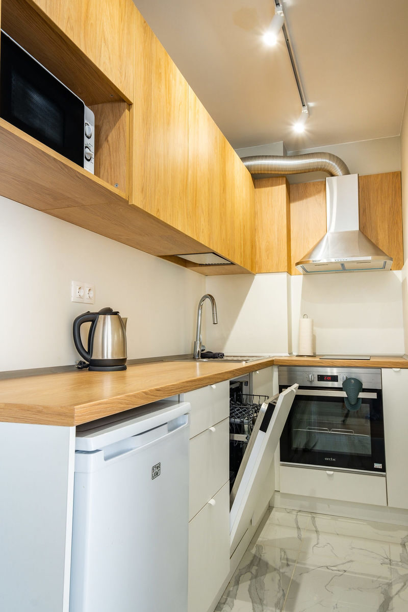 Разполага с площ от 60кв.м, разпределени в две стаи - дневна с комфортен диван, 55-инчов телевизор с цифрова телевизия с 300 канала, трапезария, напълно оборудвана кухня (кафе машина и кафе, чай, захар, посуда, котлон, абсорбатор, кана за чай), климатик, тераса с външна мебел, баня с тоалетна, антре, спалня с матрак от мемори пяна, гардероб, ютия и дъска за гладене, сешоар, бюро (подходящо за работа) и конвектор.