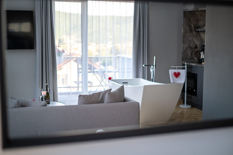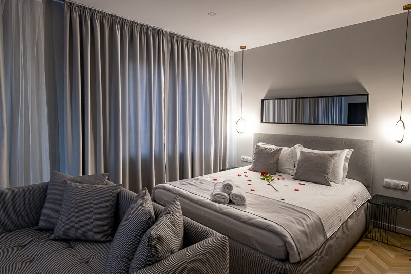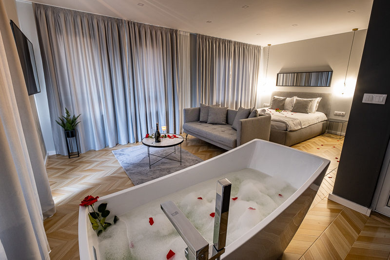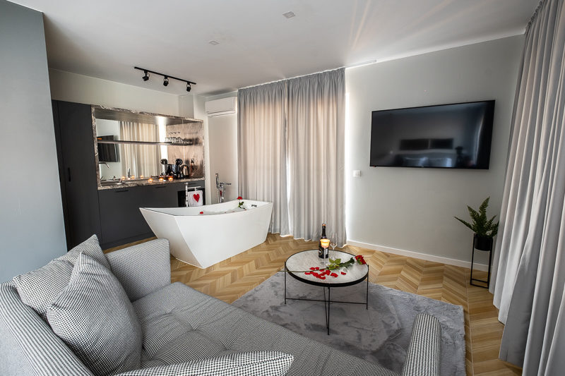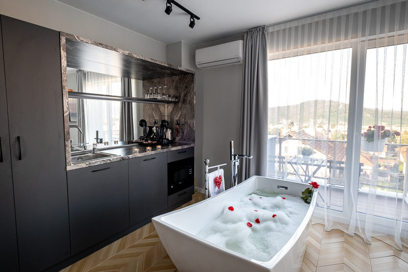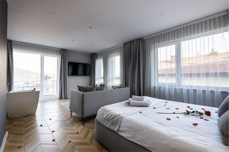 Разполага с площ от 35кв.м. Романтика, лукс и прекрасна гледка към града и планината. Матракът от мемори пяна и възглавниците от пера ще направят престоя ви незаменим и незабравим. Ваната, разположена в средата на френския прозорец към терасата ще ви накара да се отпуснете. Кухненският кът е оборудван с хладилник, микровълнова фурна, кафе машина, кана за топла вода, чаши, чинии. Телевизорът е 55 инча с цифрова телевизия с 300 канала.