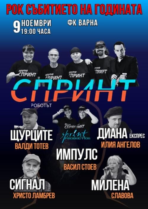 На сцената на зала 1 на Фестивалния комплекс Варна предстои да избухне концерт, какъвто българската публика не е виждала от десетилетия. "СПРИНТ - РОБОТЪТ" ще събере на едно място групата "Спринт" и истински титани на родния рок: Валди Тотев ("Щурците"), Христо Ламбрев ("Сигнал"), Илия Ангелов ("Диана Експрес"), Милена Славова и легендите от "Импулс". Тази комбинация обещава не просто концерт, а рок апотеоз - празник на музиката, енергията и вечните послания.