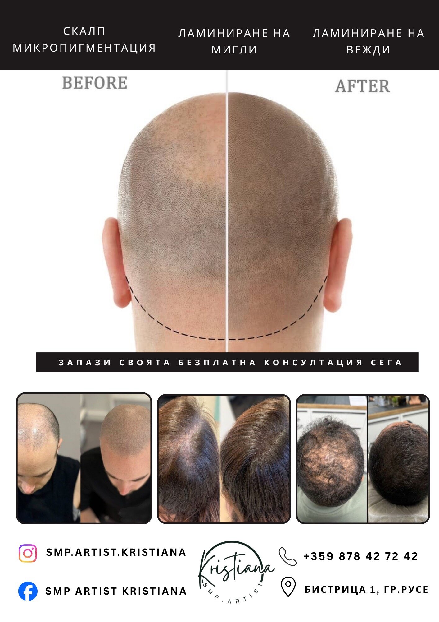Скалп микропигментацията е иновативна, неинвазивна процедура, която имитира естествен растеж на коса чрез микро точки пигмент върху скалпа. Подходяща е за мъже и жени, страдащи от косопад, оредяване на косата, белези по скалпа или просто желаещи да възстановят визуалната гъстота и форма на косата си. Грабнете предложението на SMP Artist Kristiana!