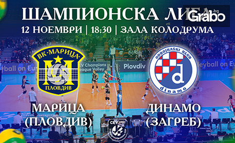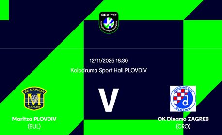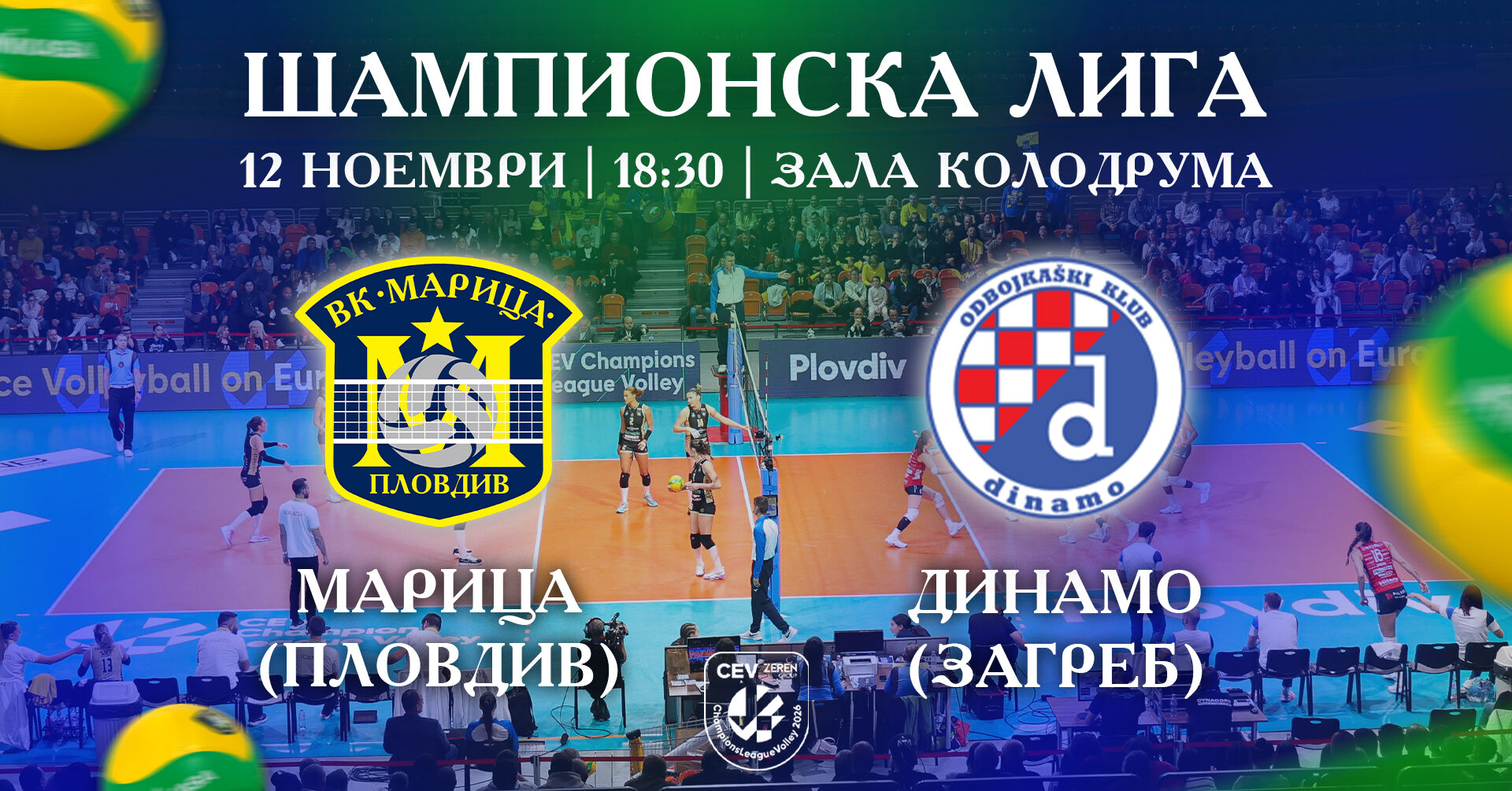 Волейболната среща "Марица" Пловдив и OK Dinamo Загреб (Хърватия) на 12 Ноември от 18:30ч, в Спортна зала "Колодрума", Пловдив: