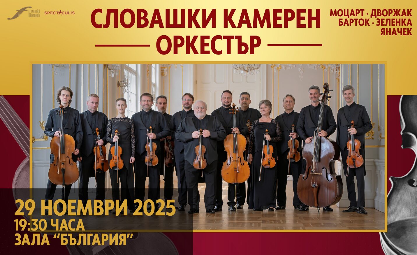 На 29 Ноември софийската публика ще има изключителната възможност да се докосне до един от най-престижните ансамбли на Централна Европа - Словашкия камерен оркестър. Създаден през 1960 г. от легендарния цигулар Богдан Варшал и от 2001 г. воден от виртуозния цигулар и диригент Евалд Данел, ансамбълът е символ на художествено съвършенство и музикална традиция, съхранявана и развивана вече повече от шест десетилетия.