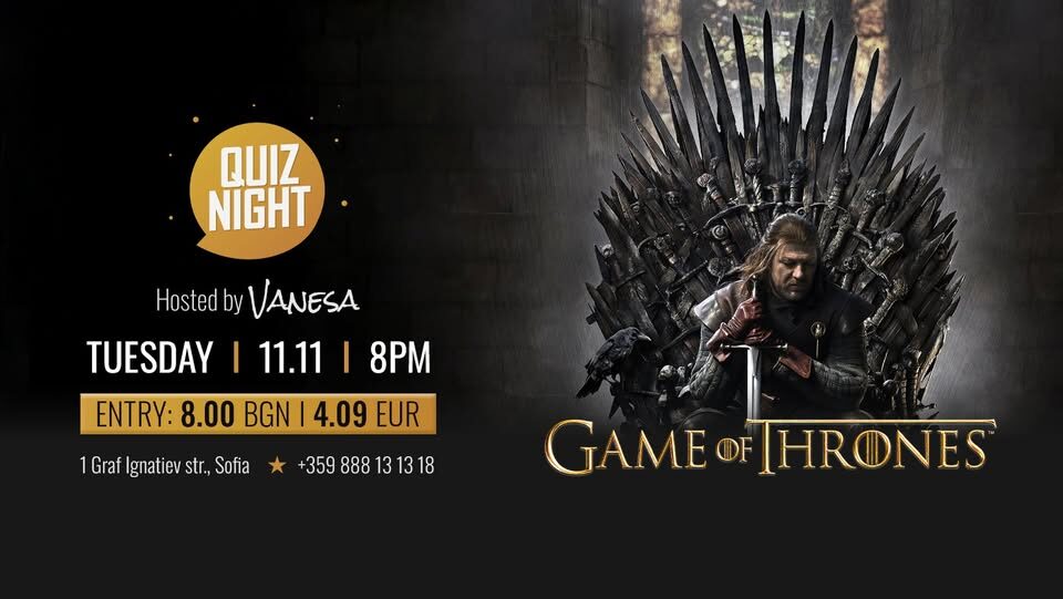 | Game of Thrones Quiz Night на 11 Ноември от 20:00ч, в Клуб Rock'n'Rolla | 6.00 лв/3.07 € вместо 8.00 лв/4.09 € | Грабни |