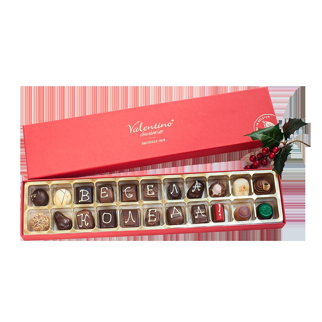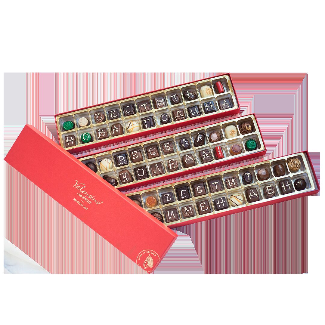 Зарадвай любим човек: Луксозна дълга кутия с персонализирани 22 асорти бонбона, от Valentino Сhocolatier