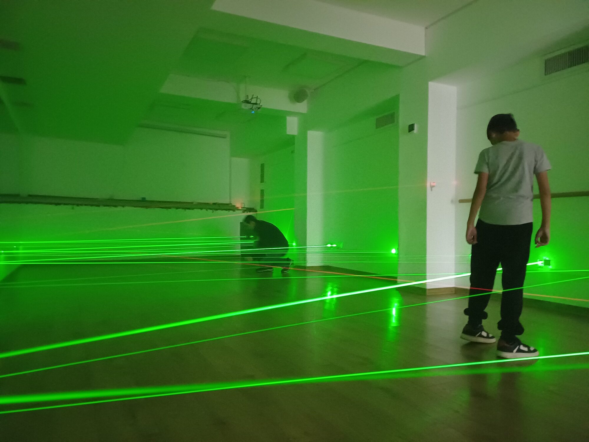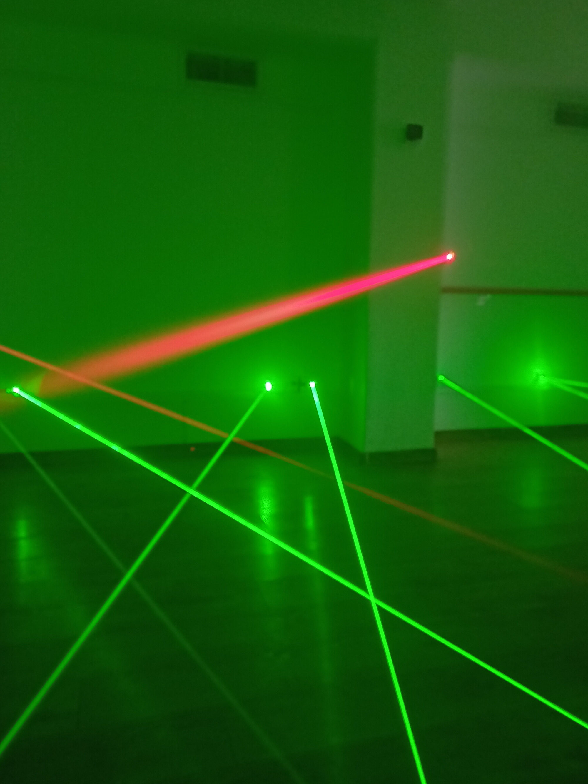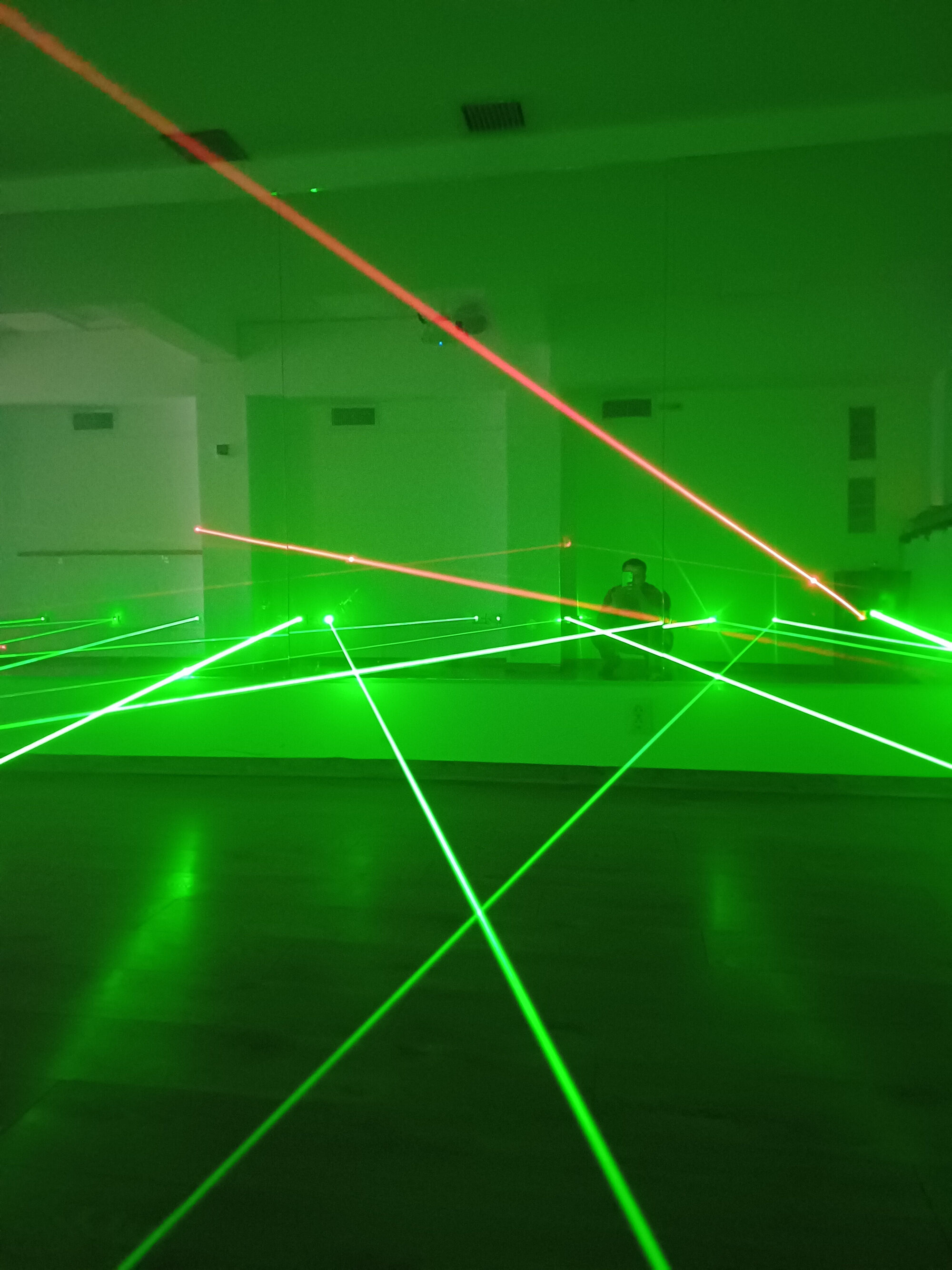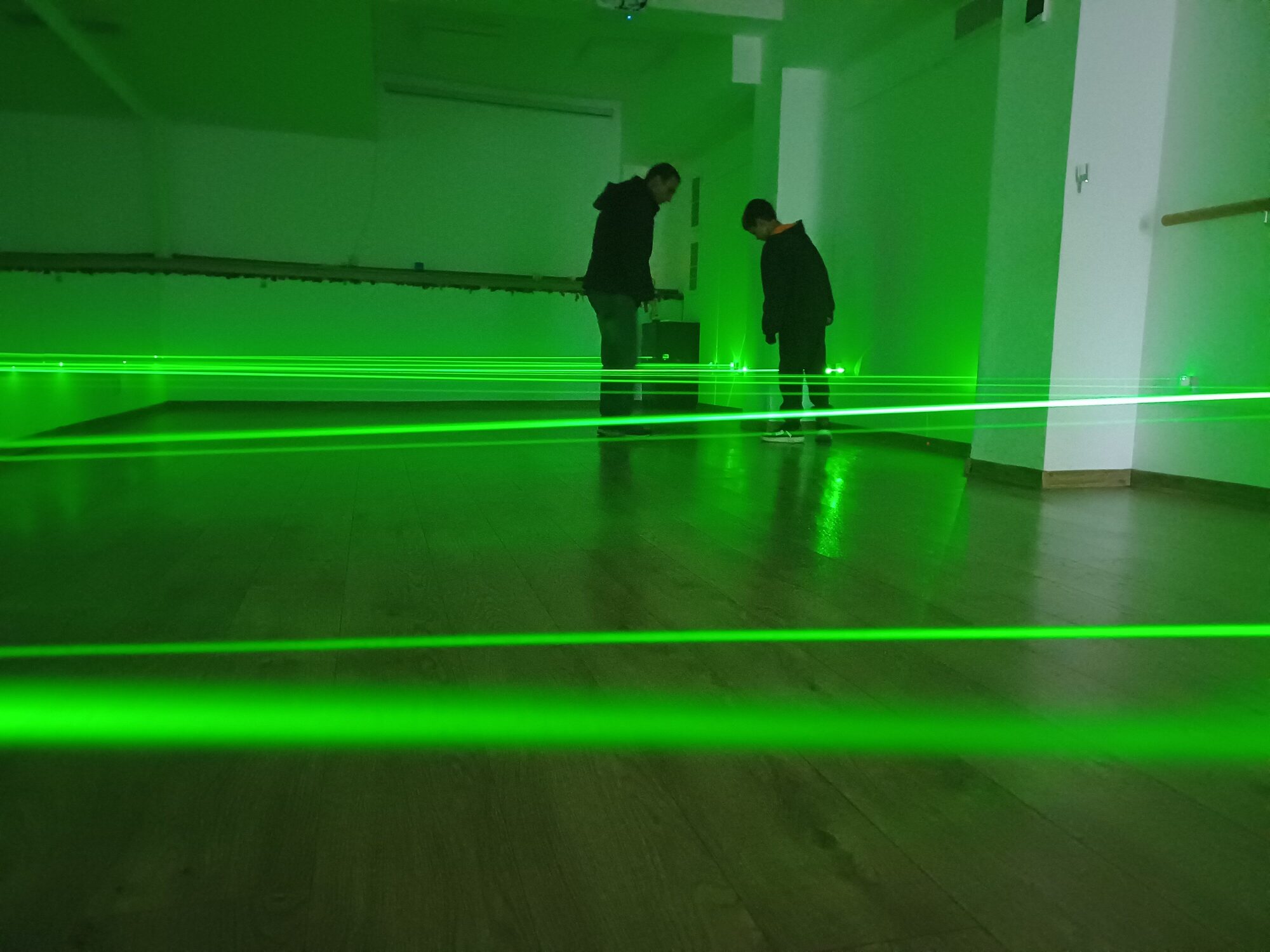 • Трасето се състои от кръстосани зелени и червени лазерни лъчи. Има три степени на трудност, през които да преминете последователно.