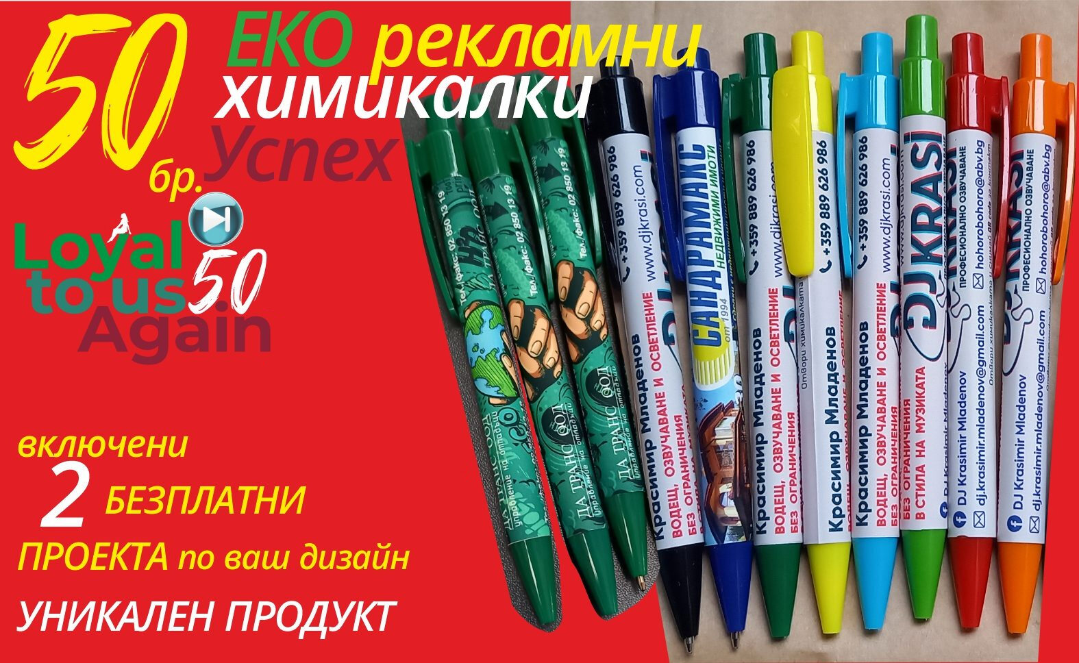 50 броя еко рекламни химикали, плюс 2 проекта по дизайн на клиента | 60.00 лв/30.68 € вместо 100.00 лв/51.13 € | Грабни |