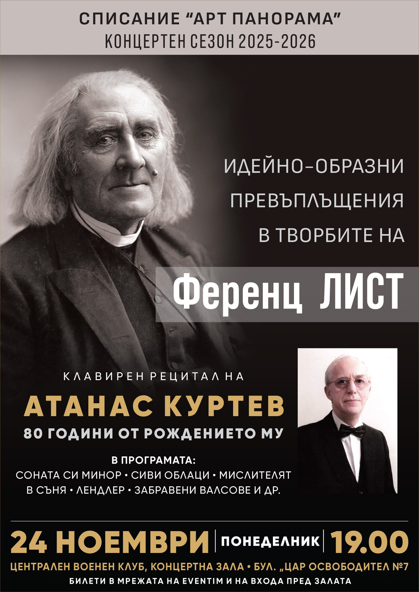 Атанас Куртев с клавирен рецитал по повод 80-годишнината от рождеието му, посветен на идейно-образни превъплъщения в творбите на Ференц Лист.