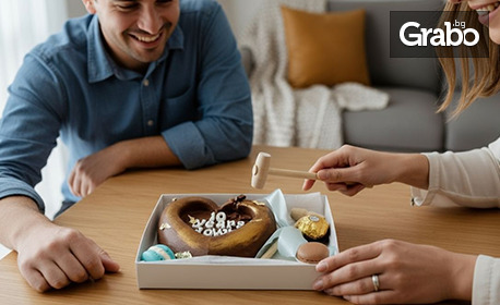 Зарадвай любимия човек с оригинална изненада от Тортите на Ив - чупещо се воколадово сърце от млечен или бял шоколад с включено чукче и декорация спрямо повода!