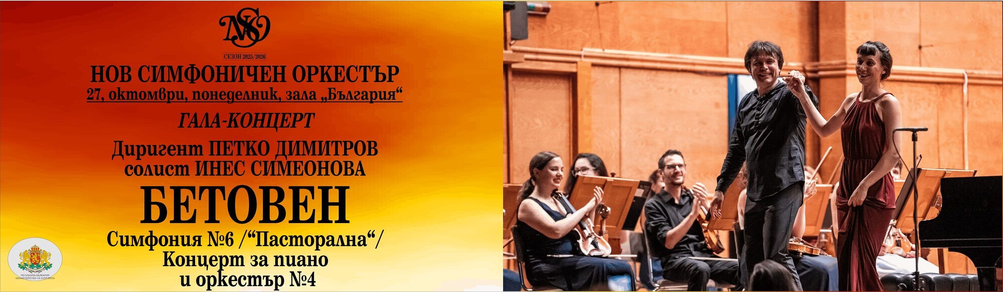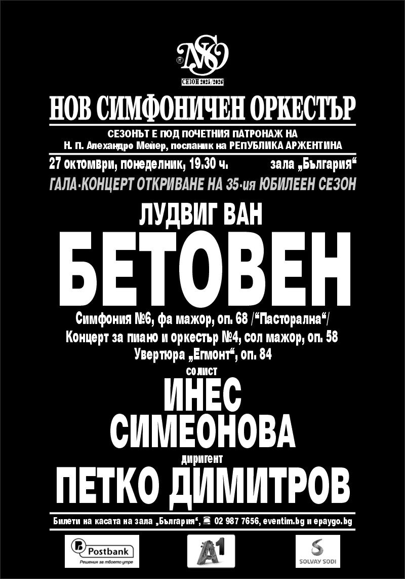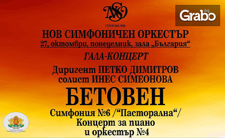 Заповядайте на вдъхновяваща музикална вечер с творчеството на Лудвиг ван Бетовен! Ще прозвучат изящният Четвърти концерт за пиано и оркестър и живописната Шеста симфония ("Пасторална") в изпълнение на Нов симфоничен оркестър с диригент Петко Димитров и солист изгряващата звезда Инес Симеонова!