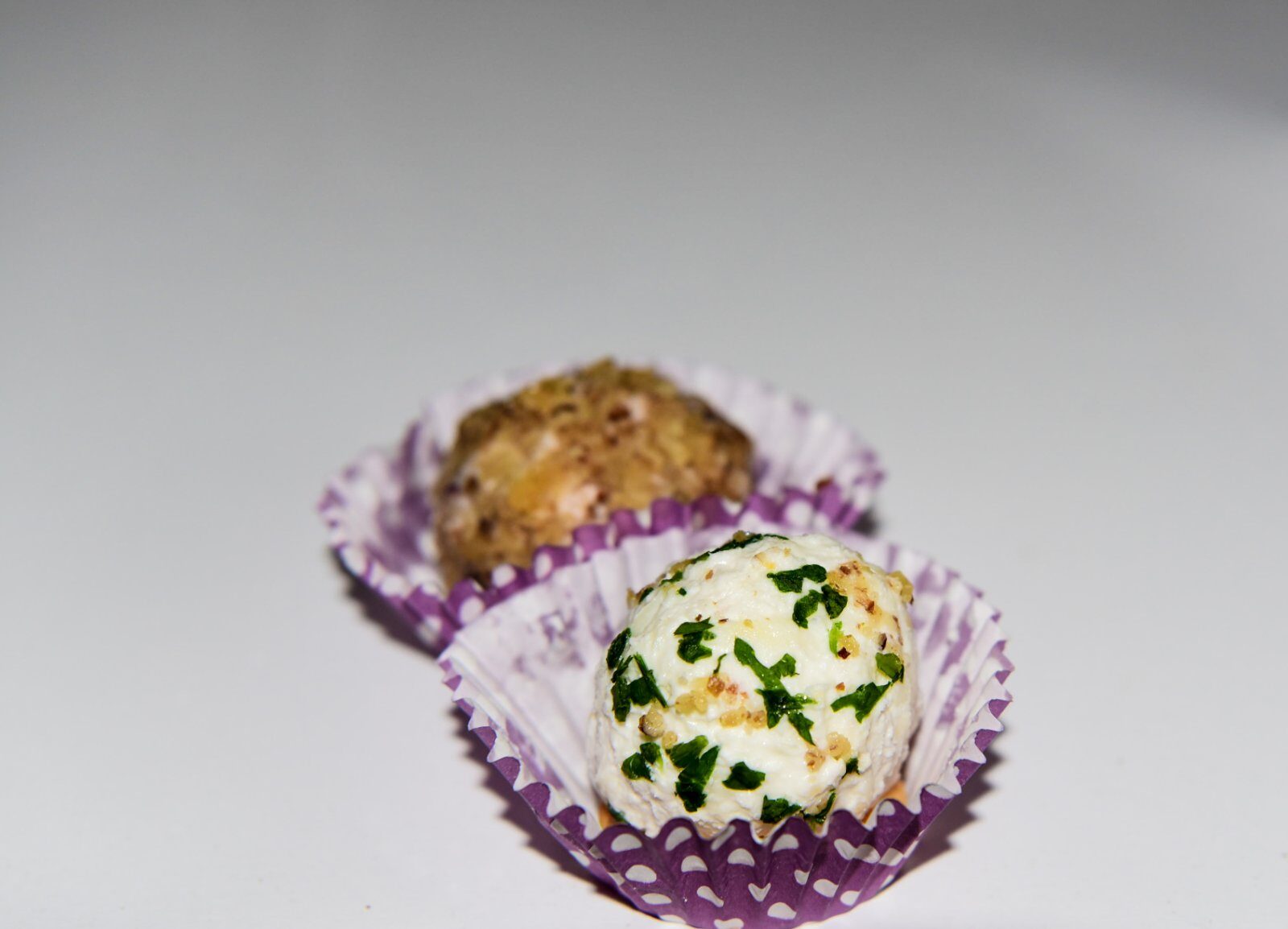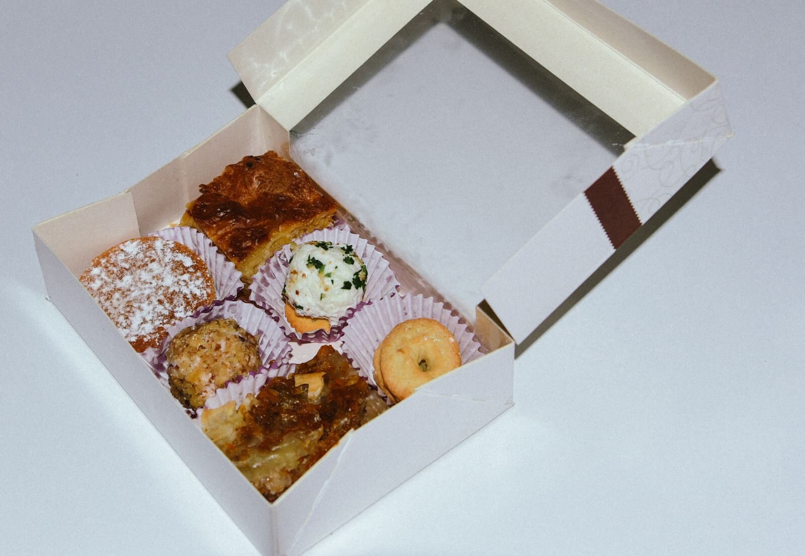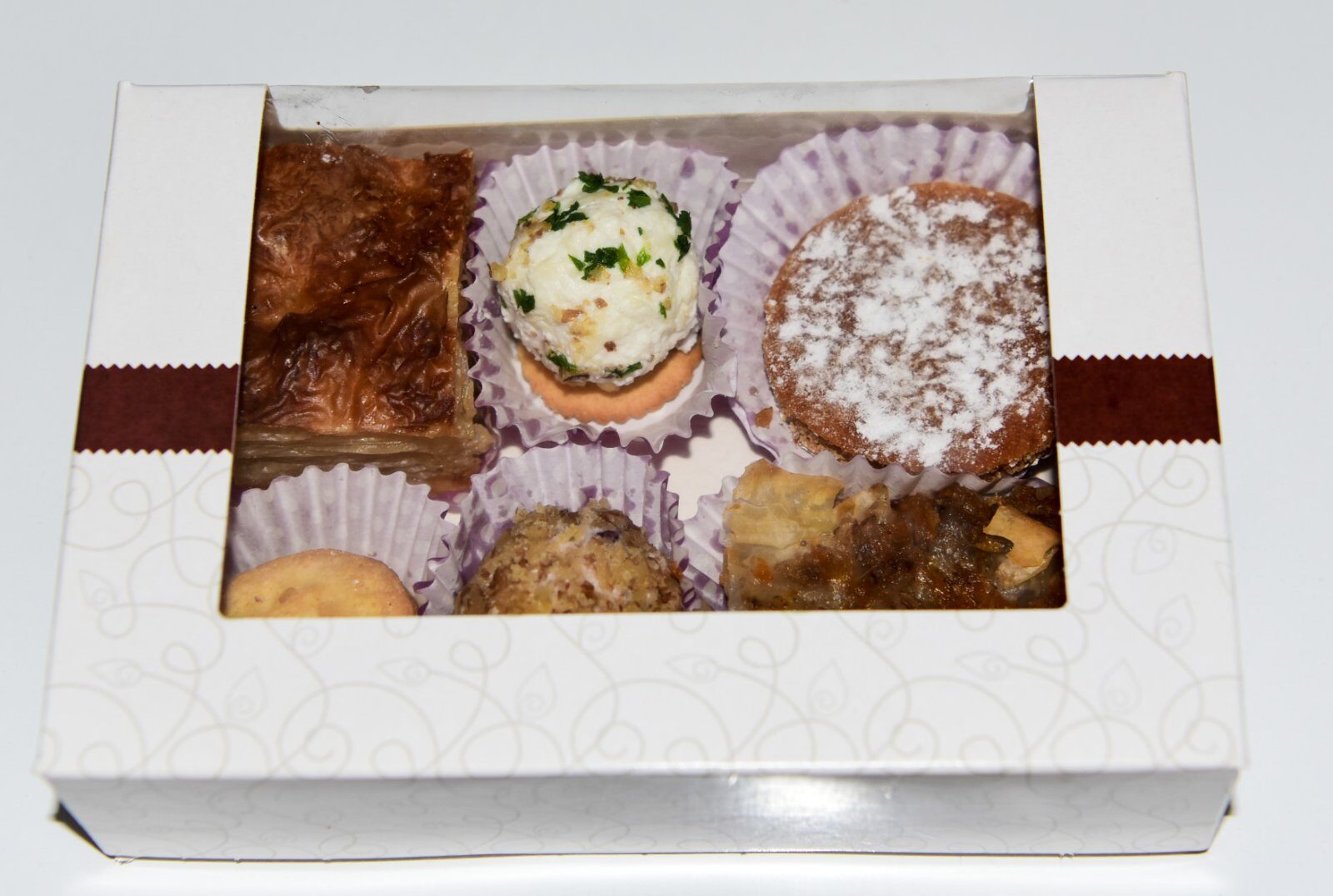 Съдържание: Парче домашна баница, тиквеник, солен трюфел с козе сирене и боровинки, солени бонбони с маслина, тарталета, меденка.
